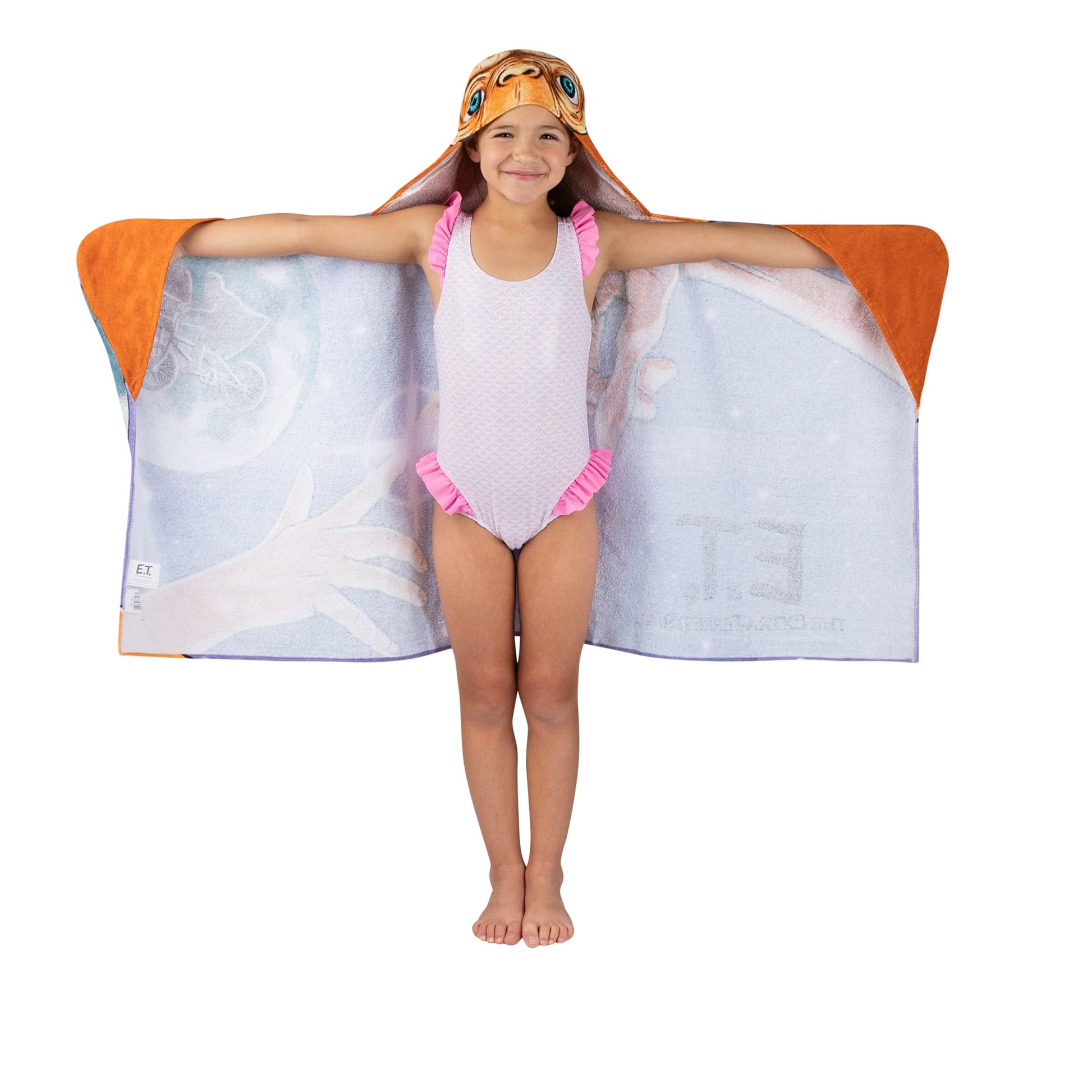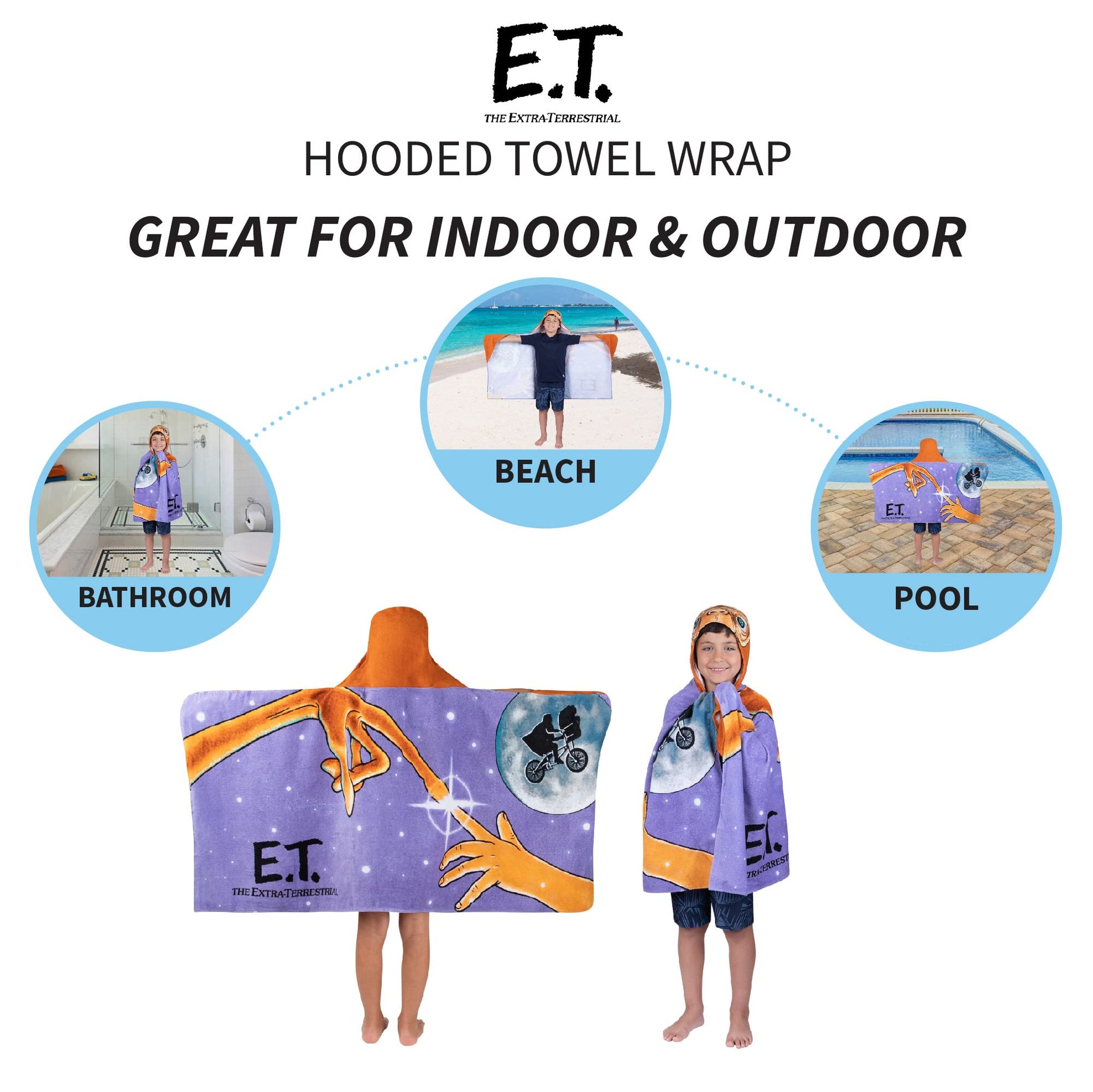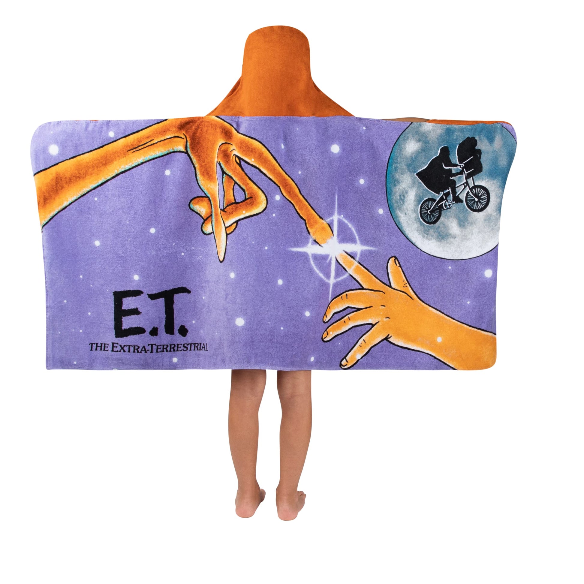 - Q: What design does the towel feature? A: The towel features an 'Over the Moon' pattern showcasing ET and Elliot from the iconic film ET The Extra-Terrestrial.