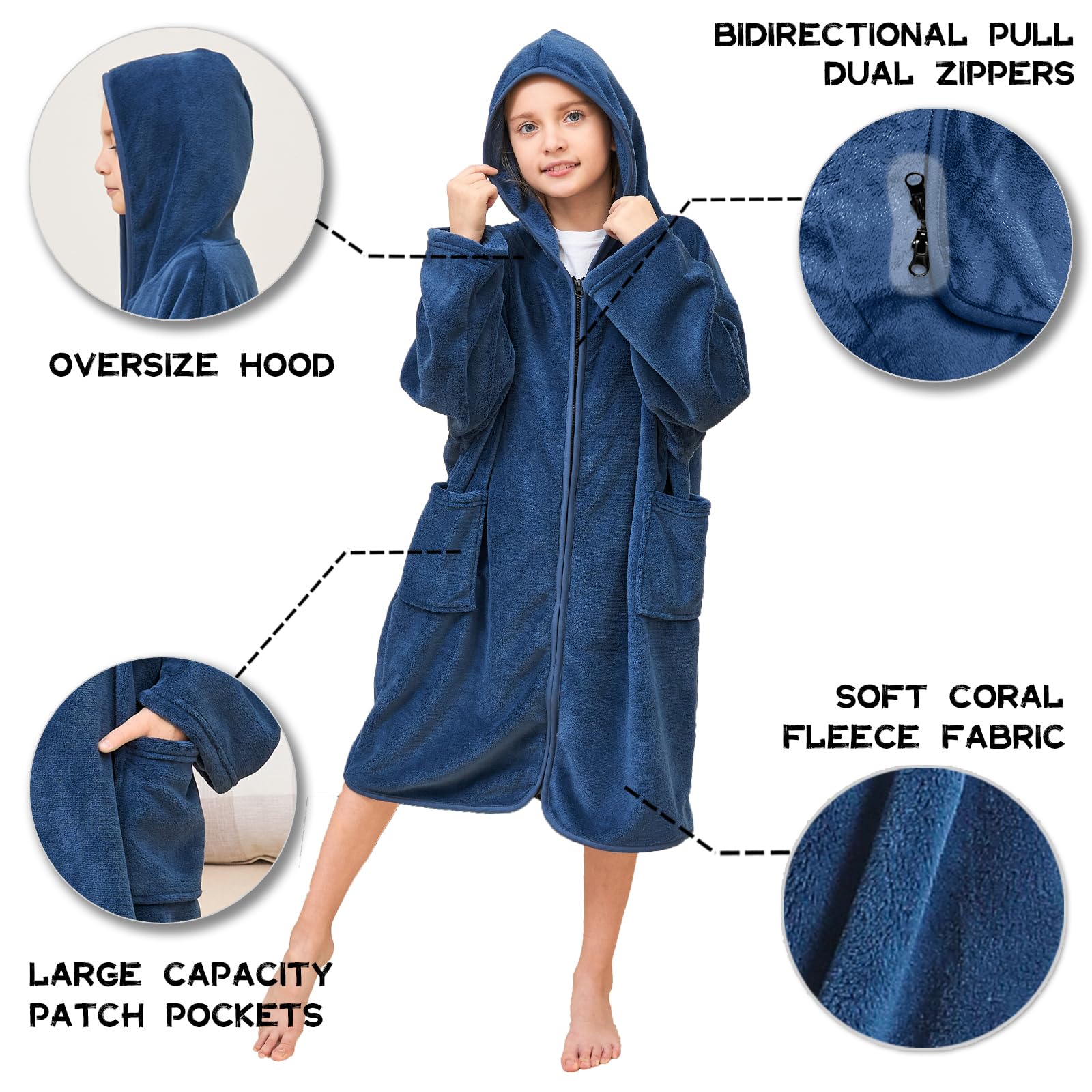 Kids Zip Up Changing Towel Surf Poncho with Hood for Beach, Swimming, Surfing, Home Bath, Unisex Plus Size!Keep your body warm pre and past bath time with this coral fleece changing robe. The supremely soft and cozy robe is made of 100% polyester. Purchase it for ultimate snuggles and cuddles with your body, or it makes for a perfect gift.Beautifully soft, thick and cozy, this bath towel coat is a touch of luxury for after bath or surfing cuddles.Very suitable for home, skiing, snow sports, outdoor sports camping, hiking, hiking, mountaineering, fishing, biking, winter running, also suitable for use as a robe cloak on the beach or swimming, diving, surfing, kayaking and other water sportsSpecification: Material: 100%polyesterDimensions (length x width): about 85x 65 cm / 33.5 x 25.6 inchesColor: Navy, Gray, Red, Blue, PinkThe package includes: 1pc zipper changing robe towel coatTips: According to manual measurement, there is a 1-2% difference, please check the size carefully before buying. Thank you!
