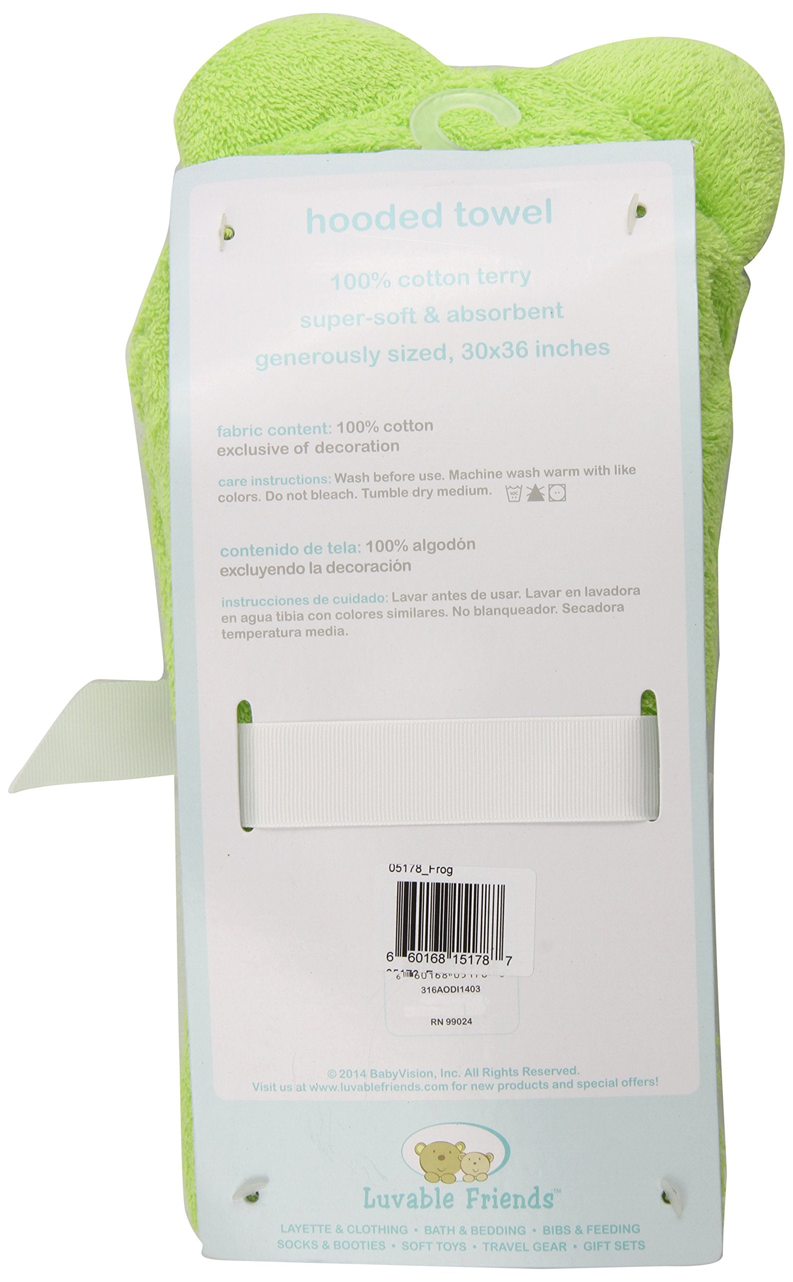 - Q: What material is the Luvable Friends Hooded Towel made of? A: The Luvable Friends Hooded Towel is made of 100% woven cotton terry, providing softness and absorbency for your baby's skin.