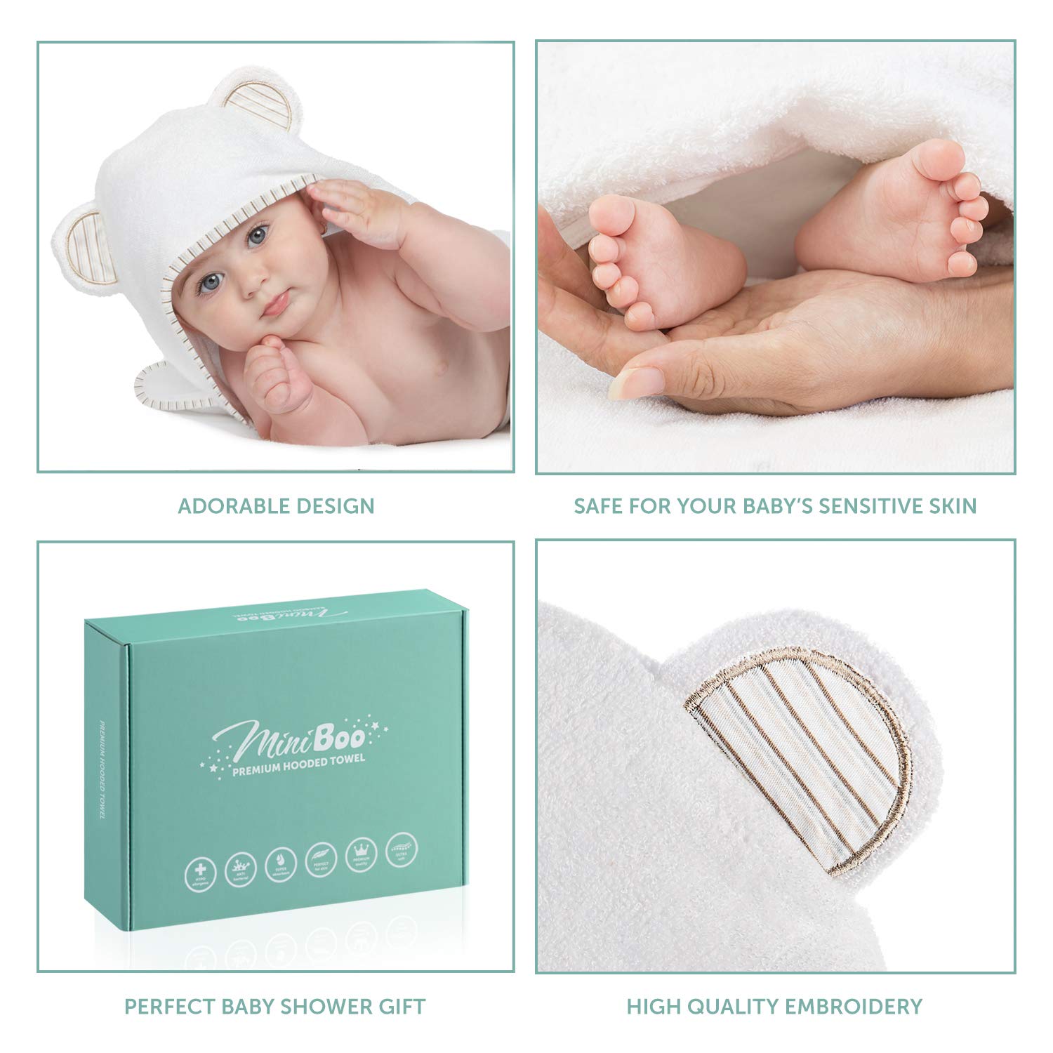 - Q: What size is the Miniboo Hooded Baby Towel? A: The Miniboo Hooded Baby Towel measures 32 by 32 inches, making it suitable for newborns, infants, toddlers, and kids up to age four.