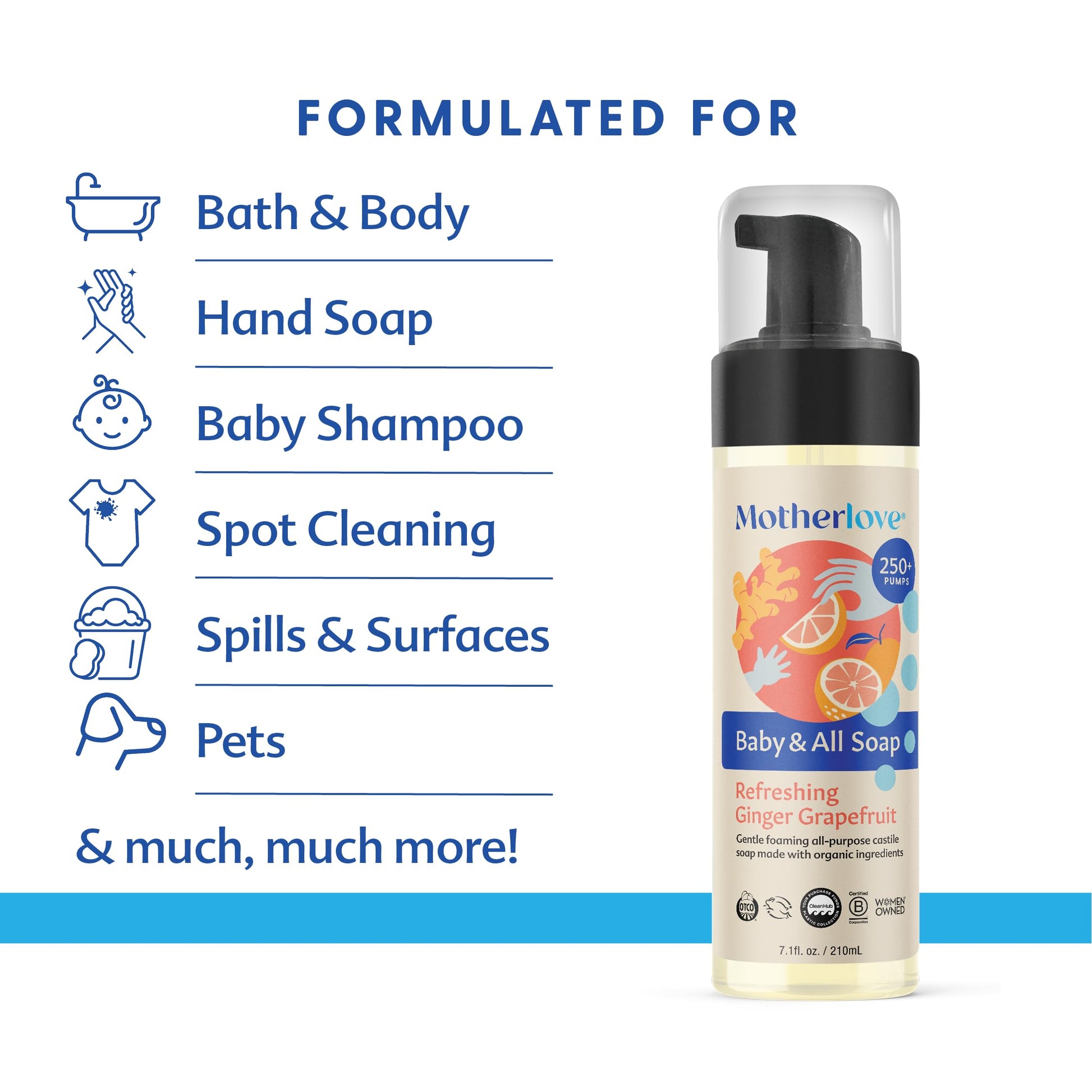 - Q: What is the suggested use for this soap? A: The soap can be used for various purposes, including as a bath and body soap, hand soap, baby and toddler shampoo, and for spot cleaning surfaces and fabrics after mealtime messes.