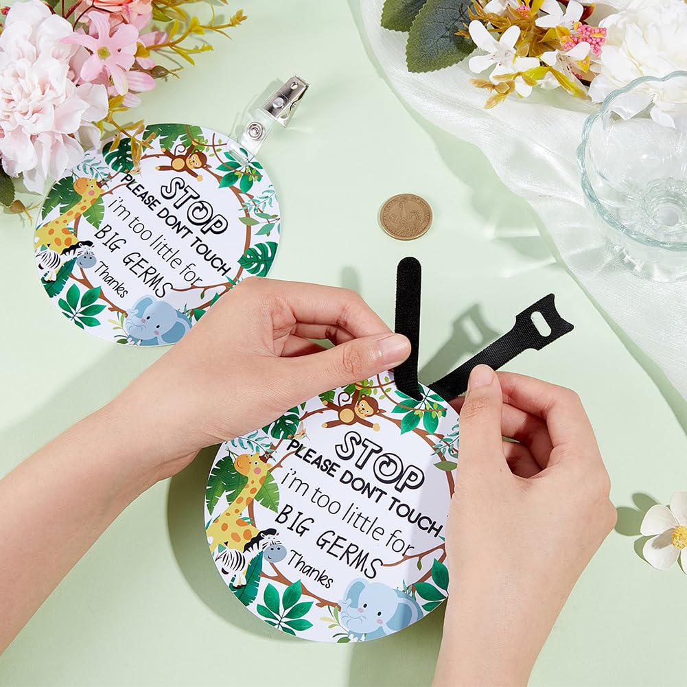 - Q: How can I attach the No Touching Baby Sign to a stroller? A: You can easily attach the sign to the stroller handle using the provided hanging straps or clips.
