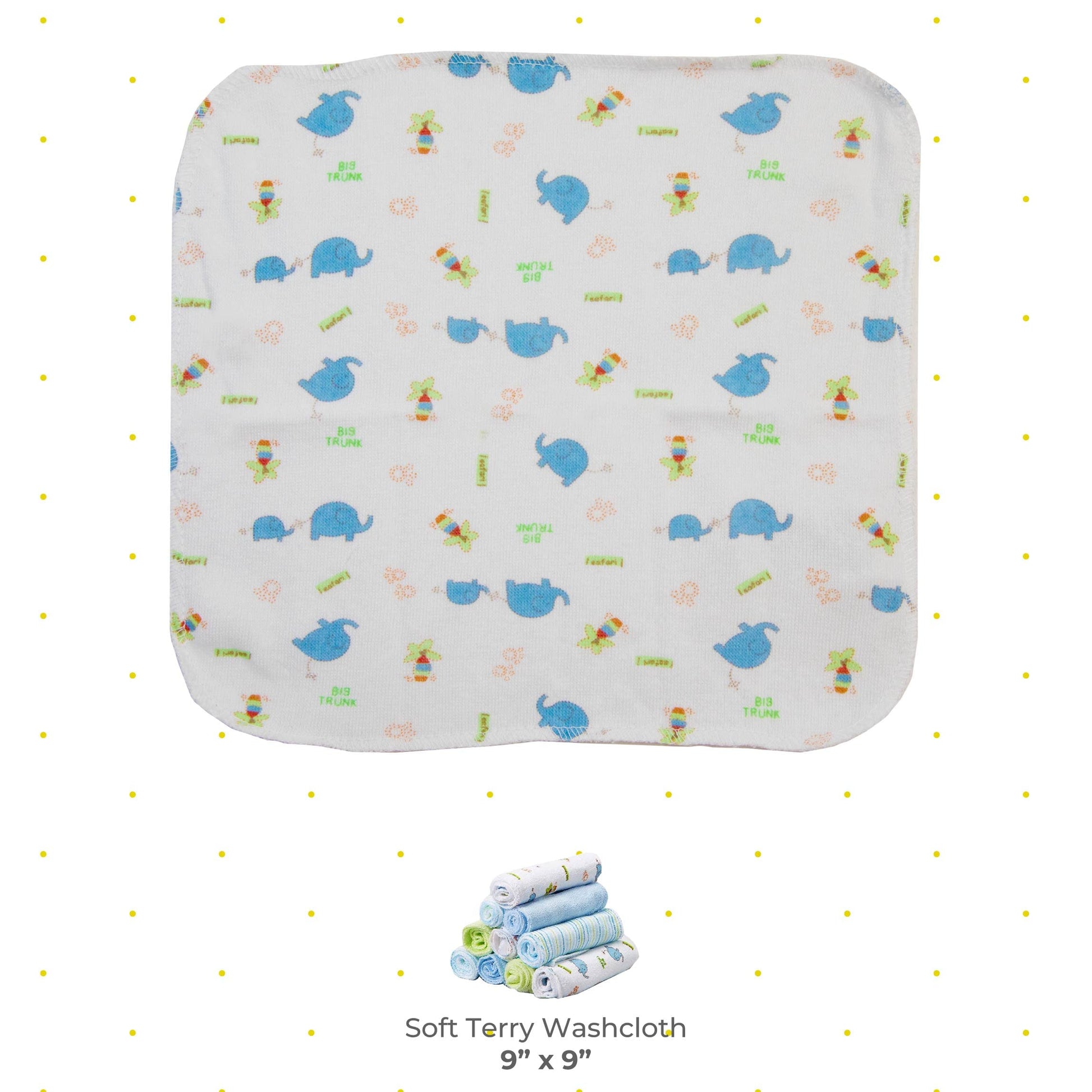 A clean baby is a happy baby. Make bath time a breeze with these washcloths. These washcloths have a lightly textured surface to get your baby clean and easily remove grime. Keep these baby towels on hand to clean up spills and other messes as well. The set of 20 washcloths come in a lovely blue elephant design that your baby will definitely love! If you have a baby shower to attend, dont fret about the gift! This baby washcloth set is perfect and practical for boys and girls alike and makes for the ideal baby shower gift. The blue elephant washcloths are made of 80% cotton and 20% polyester, and are machine washable.