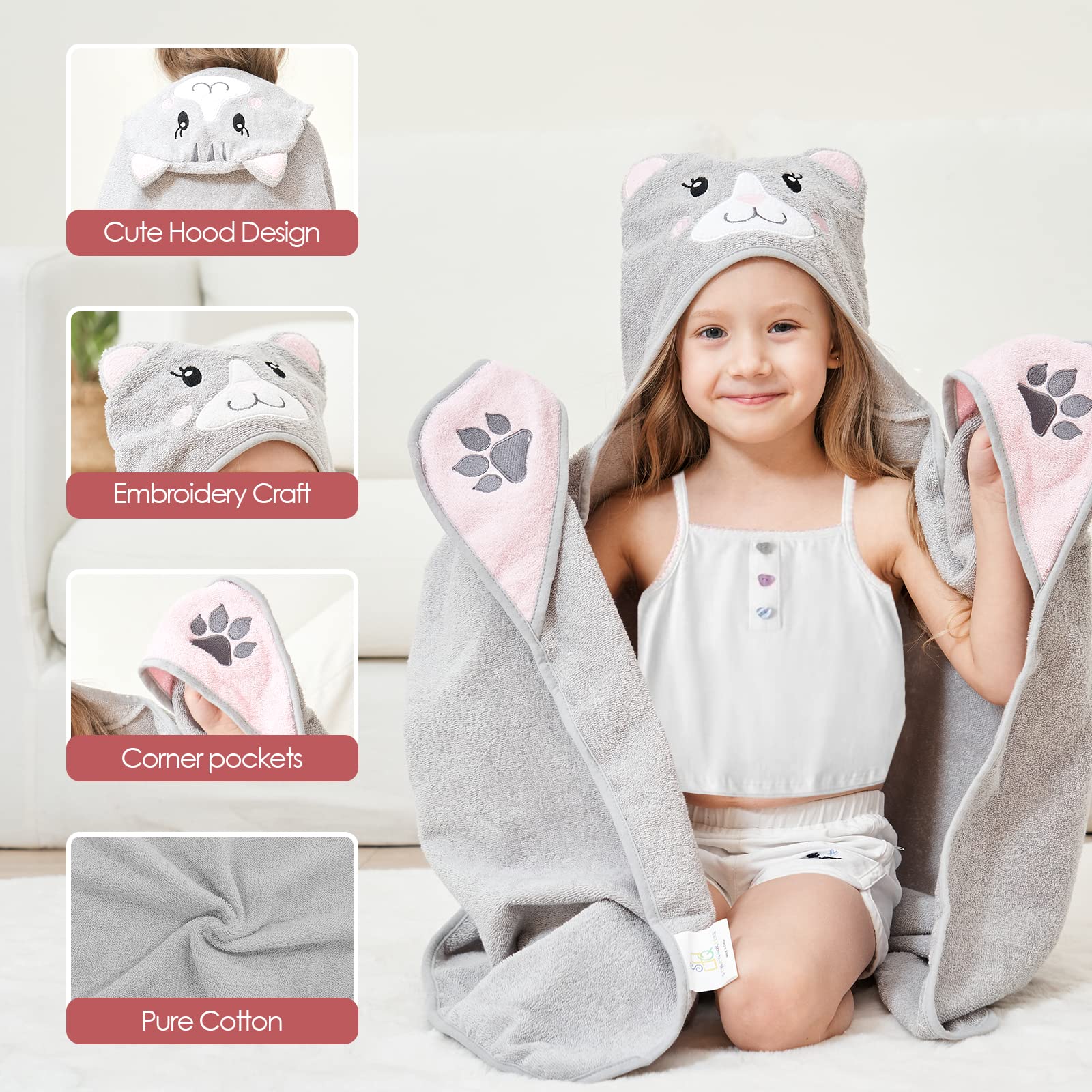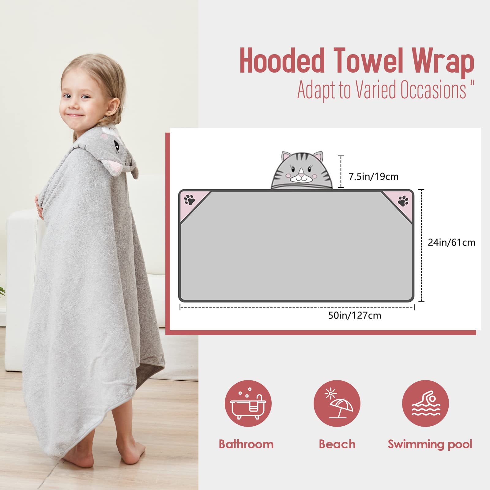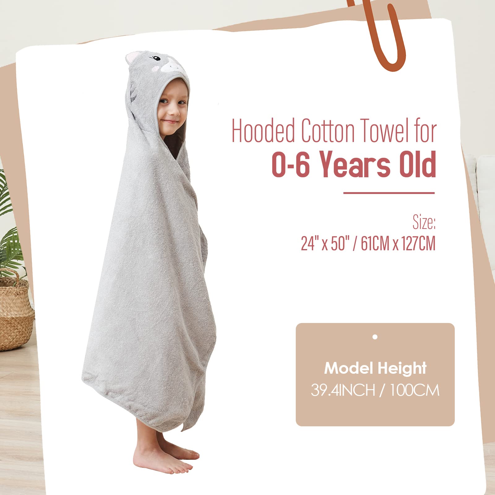 - Q: Does this towel have any special features for kids? A: Yes, the towel features a cute cartoon cat design and a hood, making bath time fun and engaging for children.