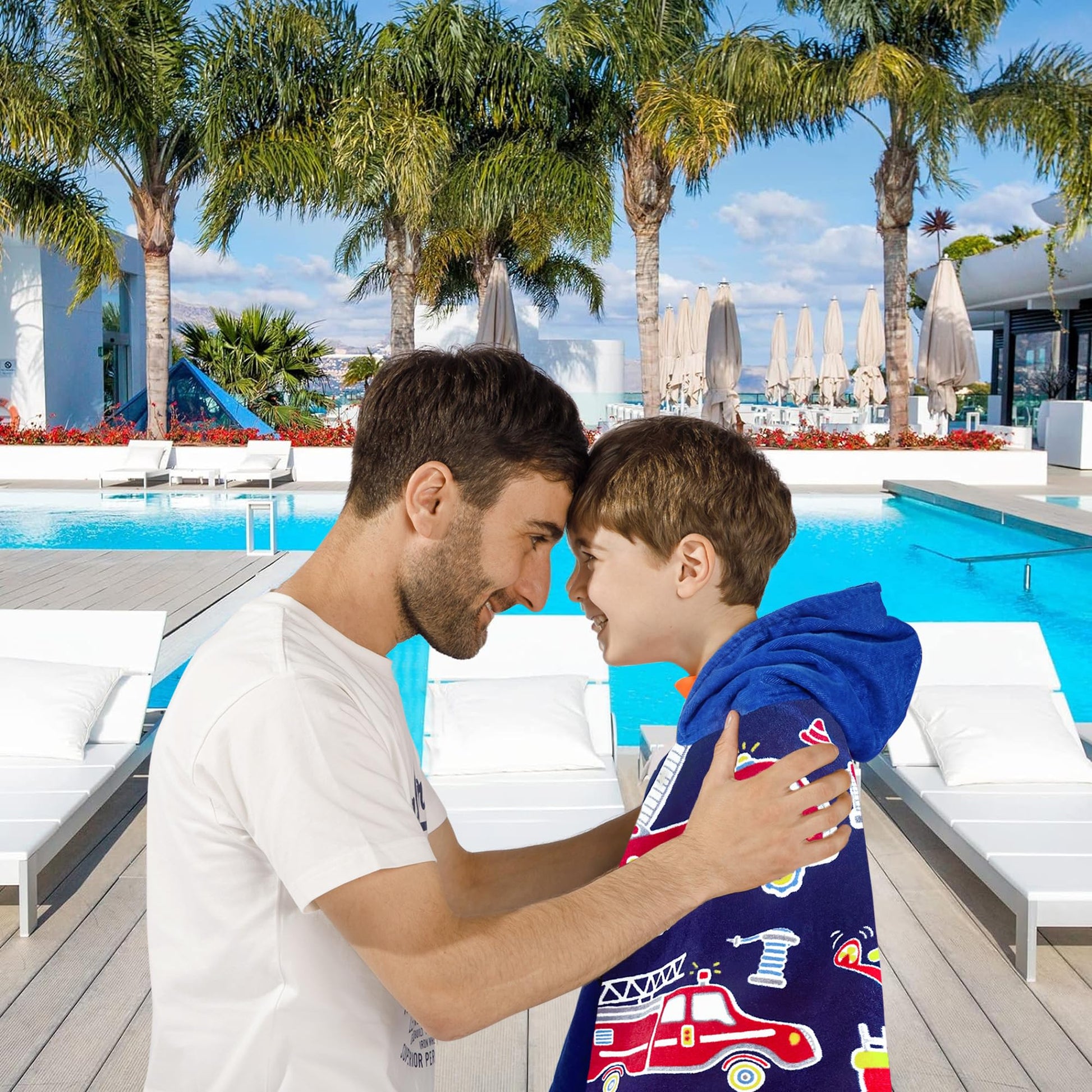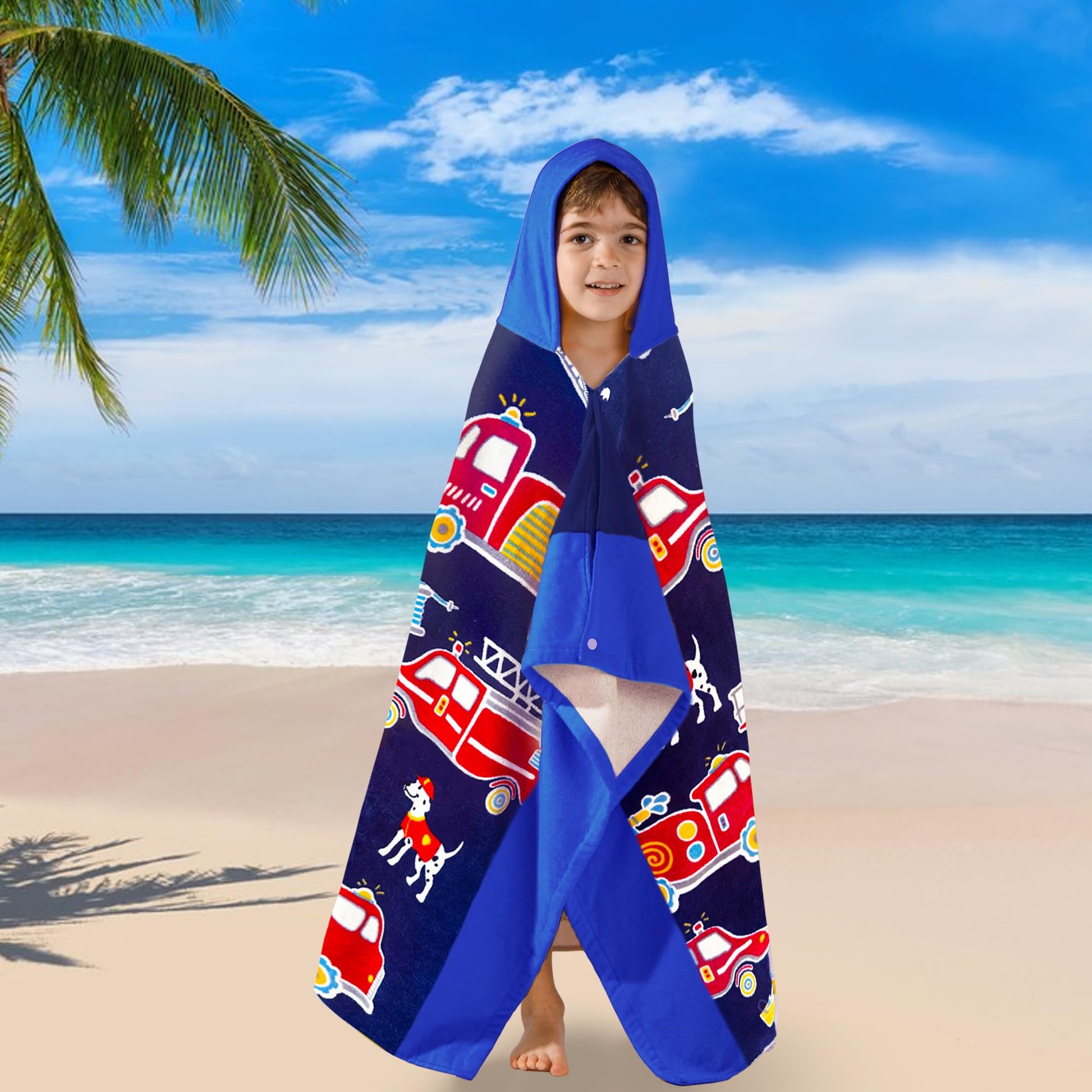 - Q: Does the towel have any special design features? A: The towel has a fun fire truck theme and includes an adjustable two-button design for easy wear and comfort.