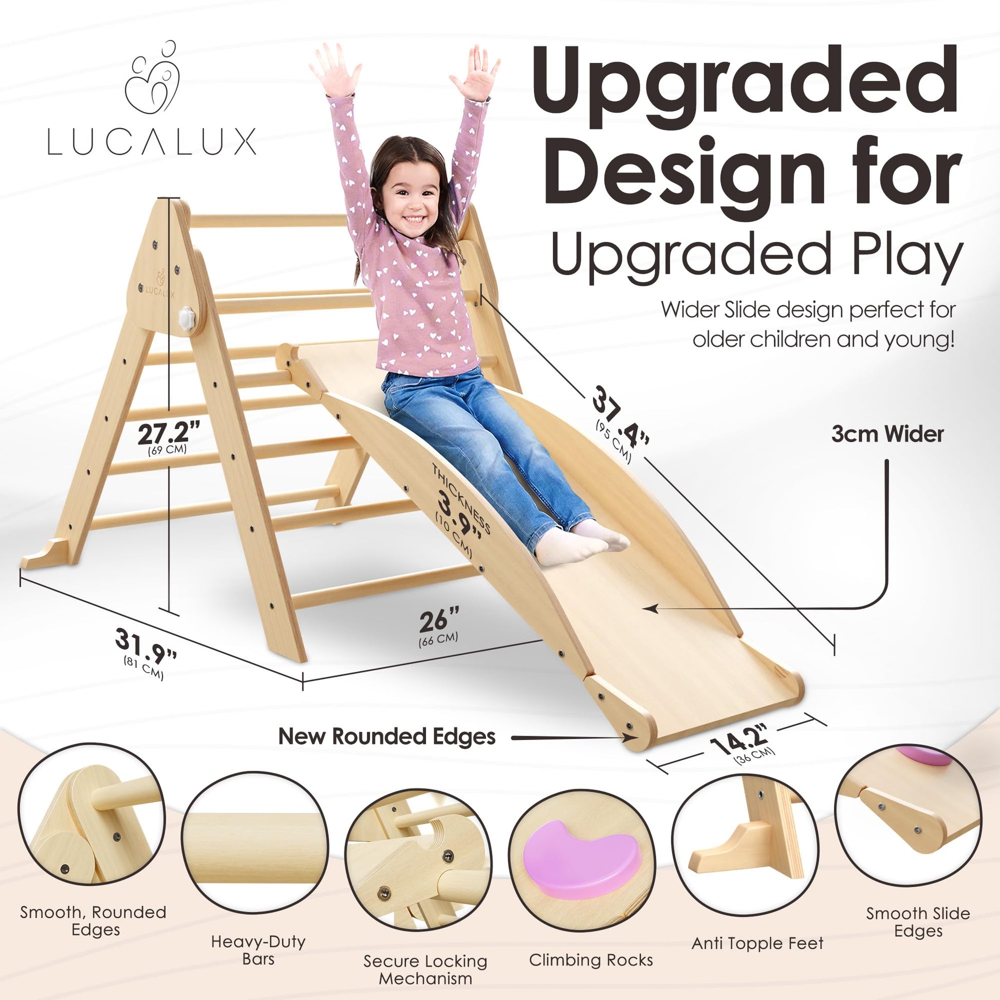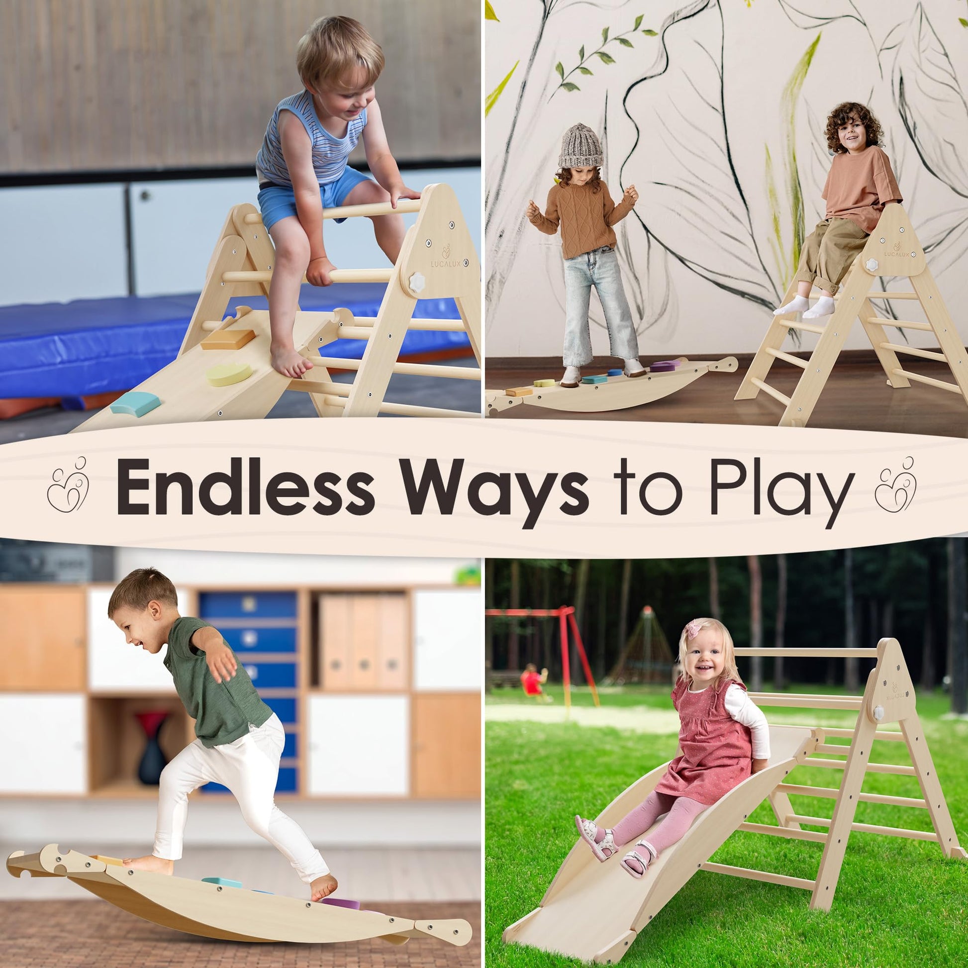 Transform your home into a world of fun with LucaLux's Baby Climbing Gym - a safe, engaging, and versatile toddler indoor playground designed to enhance your child's development and creativity! Our toddler climbing toys, such as the Pikler triangle, Montessori climbing set, and 5 in 1 climbing set, are perfect for indoor and outdoor use. This pikler triangle set, including the Pikler triangle with slide and Montessori slide and climber, are crafted from durable pine wood, ensuring longevity and resilience against the spirited play of energetic toddlers. With its smooth, rounded edges, you can rest easy knowing your child can play worry-free. This Pikler triangle climbing set offers five play modes! The indoor jungle gym for kids ages 1-3 helps build strength and coordination, the indoor slide and rock wall ignite agility and courage, and the toddler balance beam board develops balance and spatial awareness. These kids climbing toys, including indoor climbing toys for toddlers 1-3 and baby climbing toys, nurture your child's physical and social growth. The pickler-3 piece climbing gym is especially designed to fit toddlers' needs. Whether in the playroom or backyard, our climbing toys for toddlers 1-3 inside home adapts seamlessly to any environment. Its foldable features allow you to reclaim your space after a long day of play. Your child's safety is our top priority, which is why our kids' indoor play gym is ASTM and CPC-certified, ensuring that your little one can play, explore, and learn in the safest possible environment. 6 IN 1 Toddler Playground Indoor Jungle Gym Product Details: At LucaLux, we believe in fostering growth, creativity, and joy in the early stages of childhood. We aim to support parents in nurturing confident and creative children. From indoor toddler playground like montessori wood climbing set to toddler climbing toys indoor, we offer a comprehensive collection to suit every need.