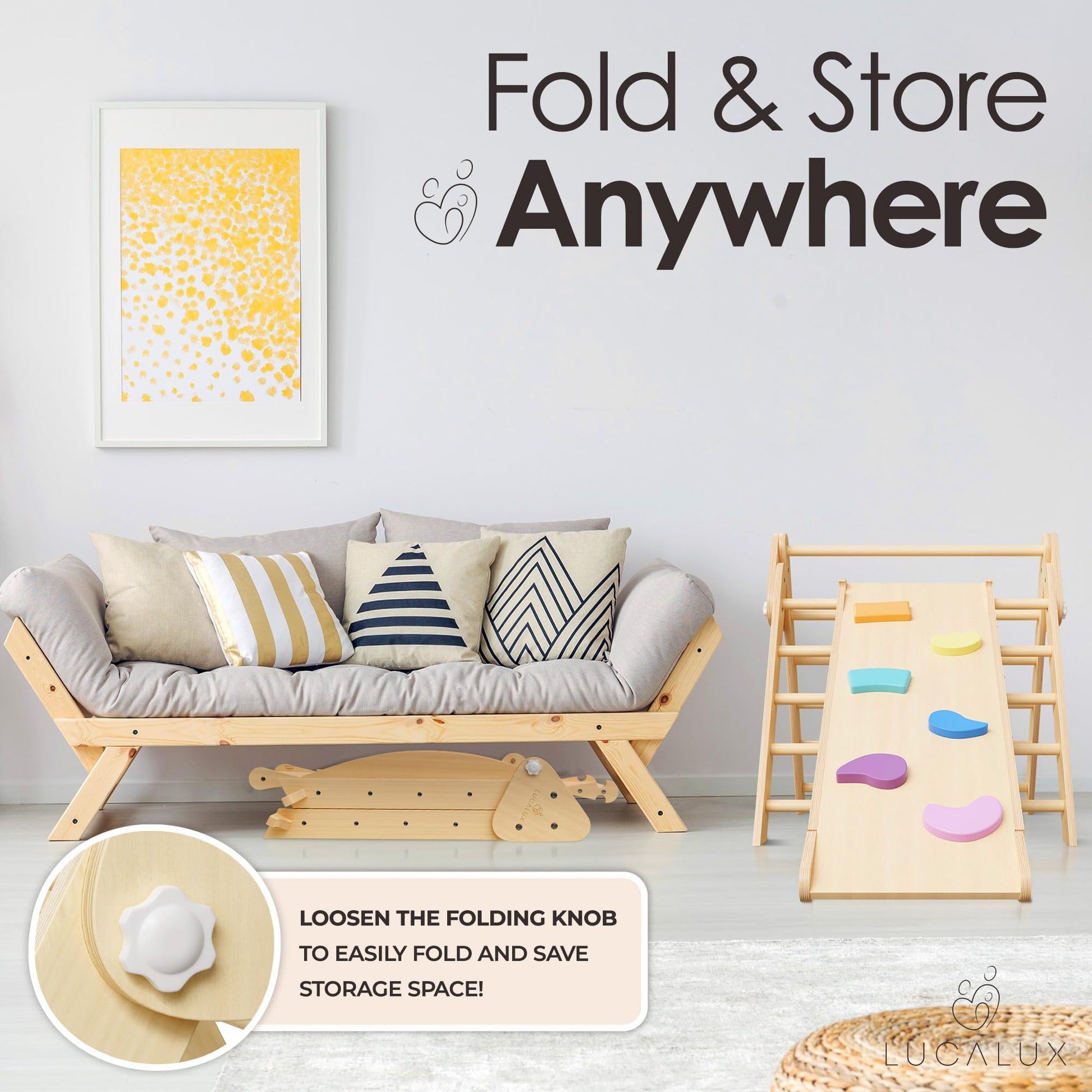 • Q: How do I store the climbing set when not in use? A: The climbing set is foldable, allowing you to easily reclaim your space by loosening the folding knob and storing it away when playtime is done.