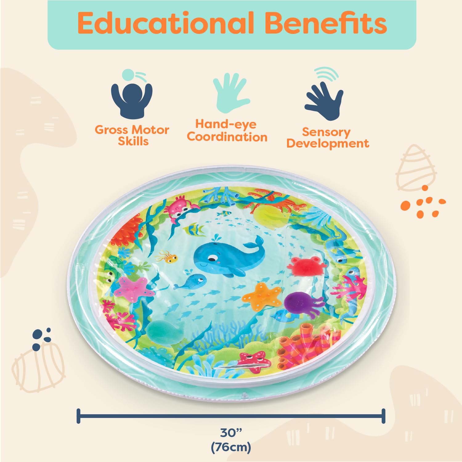 - Q: What are the dimensions of the water mat? A: The inflatable water mat measures 30 inches in diameter.