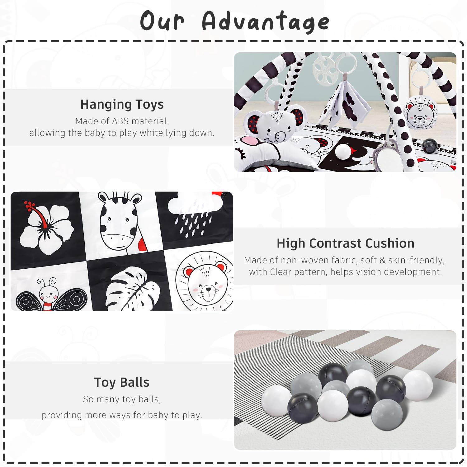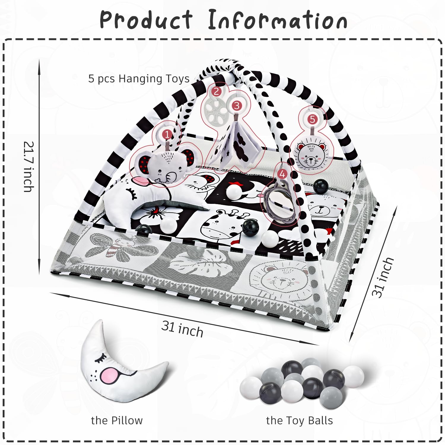 - Q: What makes this play mat a good gift choice? A: The Baby Play Mat's unique black and white design, along with its educational features, makes it a thoughtful gift for baby showers and nursery decor.