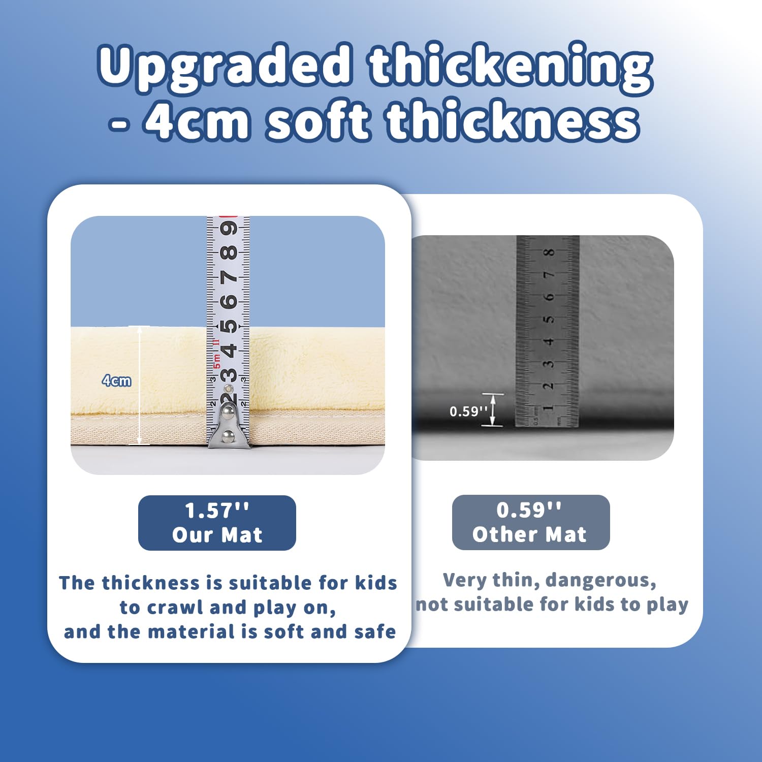- Q: How thick is the Baby Play Mat? A: The Baby Play Mat has a thickness of 1.57 inches, which helps cushion falls and provides a soft surface for play.