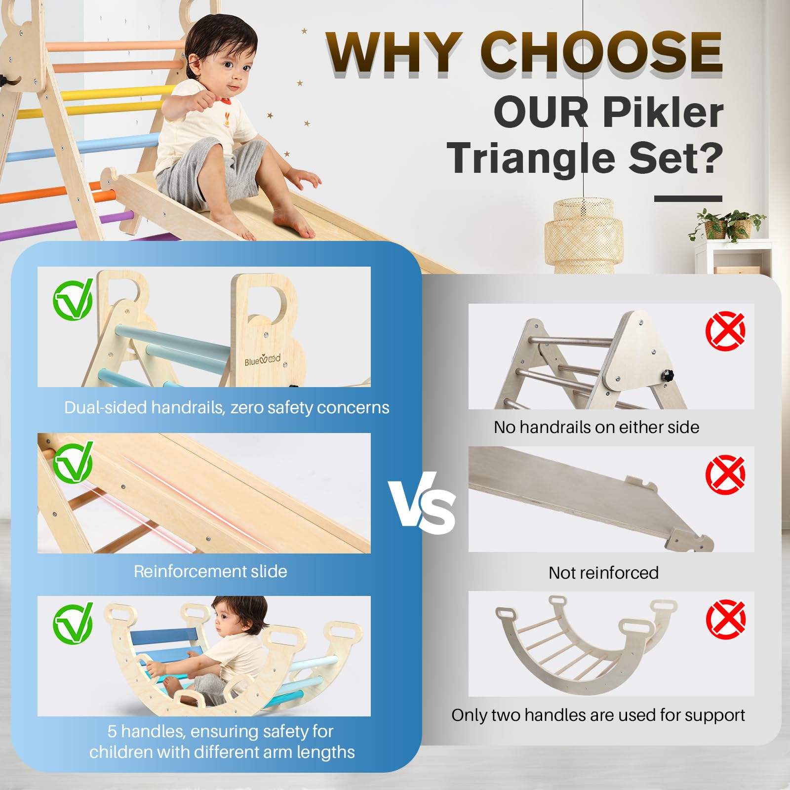 - Q: How does the BlueWood Pikler Triangle Set promote child development? A: The set encourages physical activity, creativity, and problem-solving skills through play, allowing children to grow and learn in a fun environment.