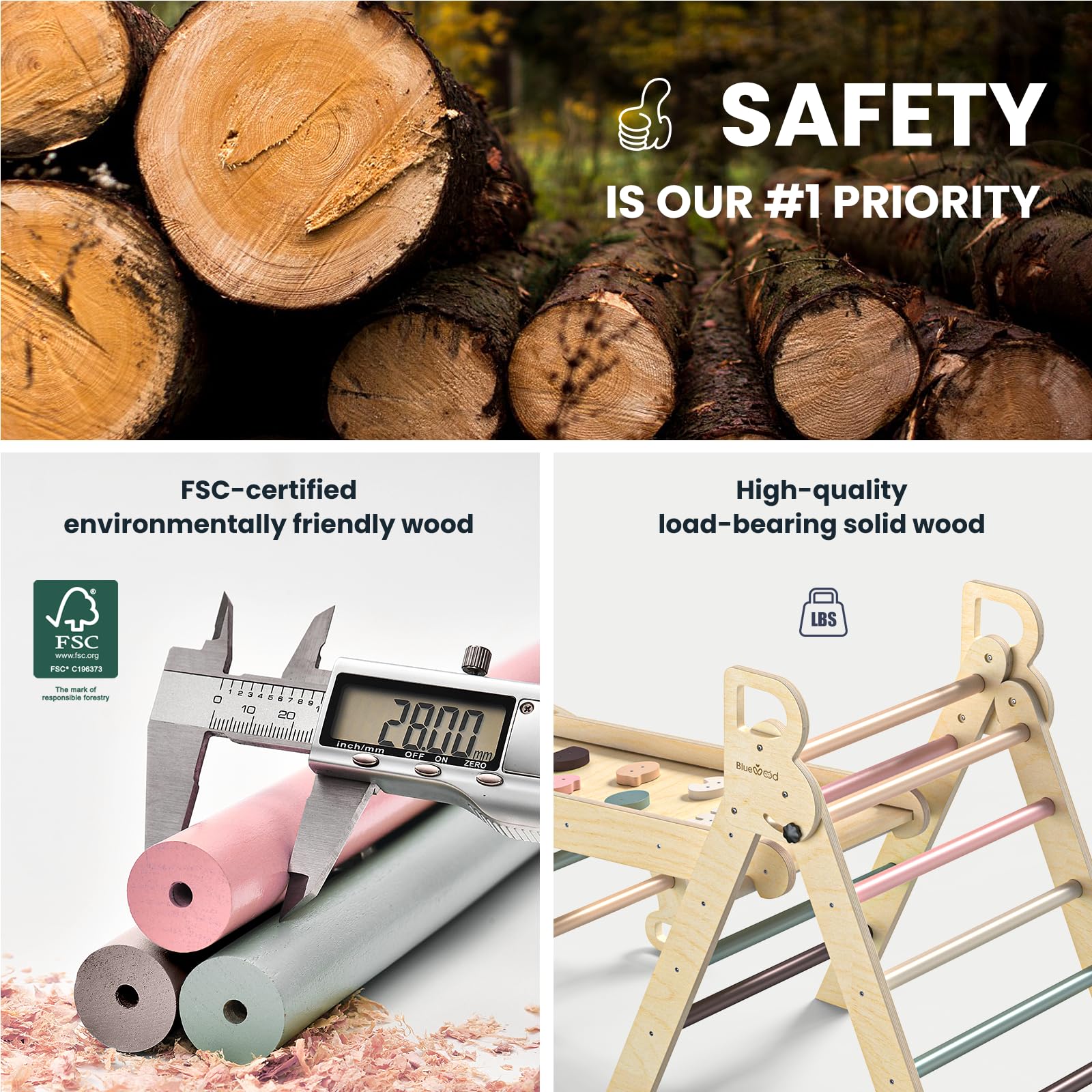 • Q: What materials are used in the BlueWood Pikler Triangle Set? A: This climbing set is made of FSC-certified natural solid wood, ensuring safety and durability.