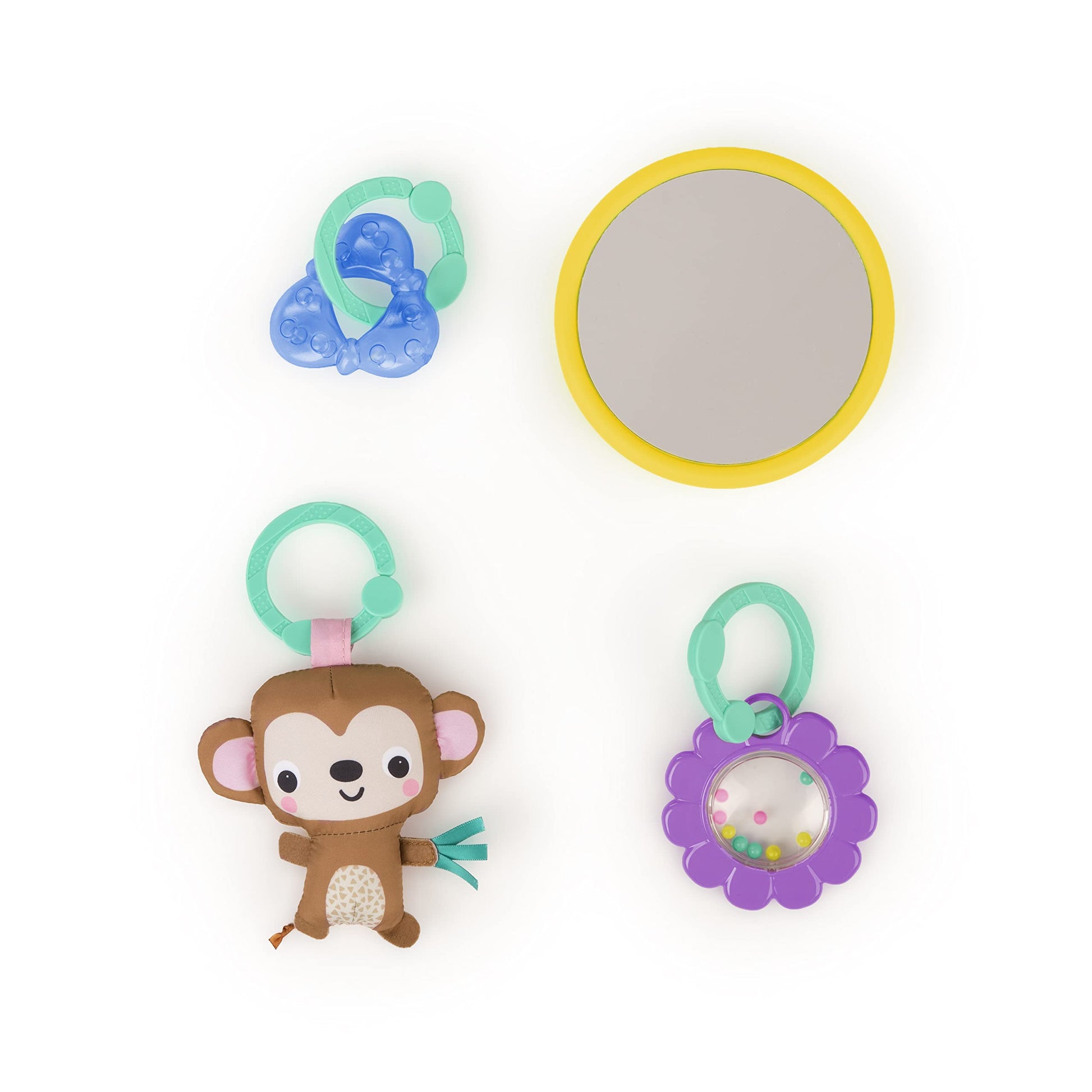 • Q: What toys are included with the activity gym? A: The activity gym includes four detachable toys: a plush monkey with jingle chimes, a baby-safe mirror, a flower rattle with colorful beads, and a soothing texture toy.