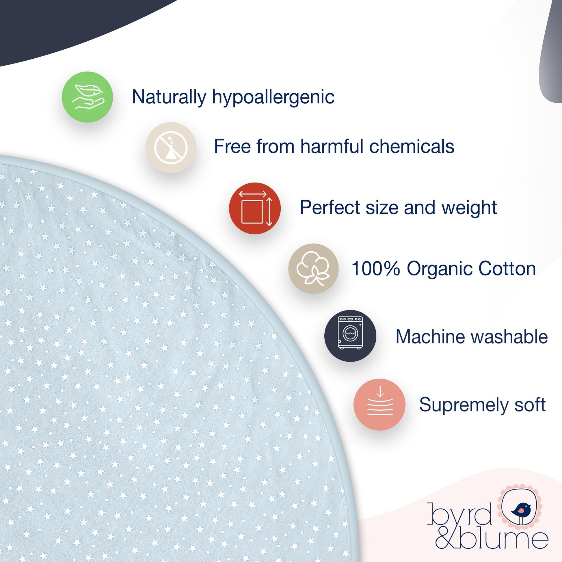 - Q: What materials are used in the Byrd & Blume Round Baby Play Mat? A: The play mat is made from soft 100% organic cotton on the outer layer and features an inner fill made from 100% Oeko-Tex certified recycled polyester, ensuring safety and comfort.