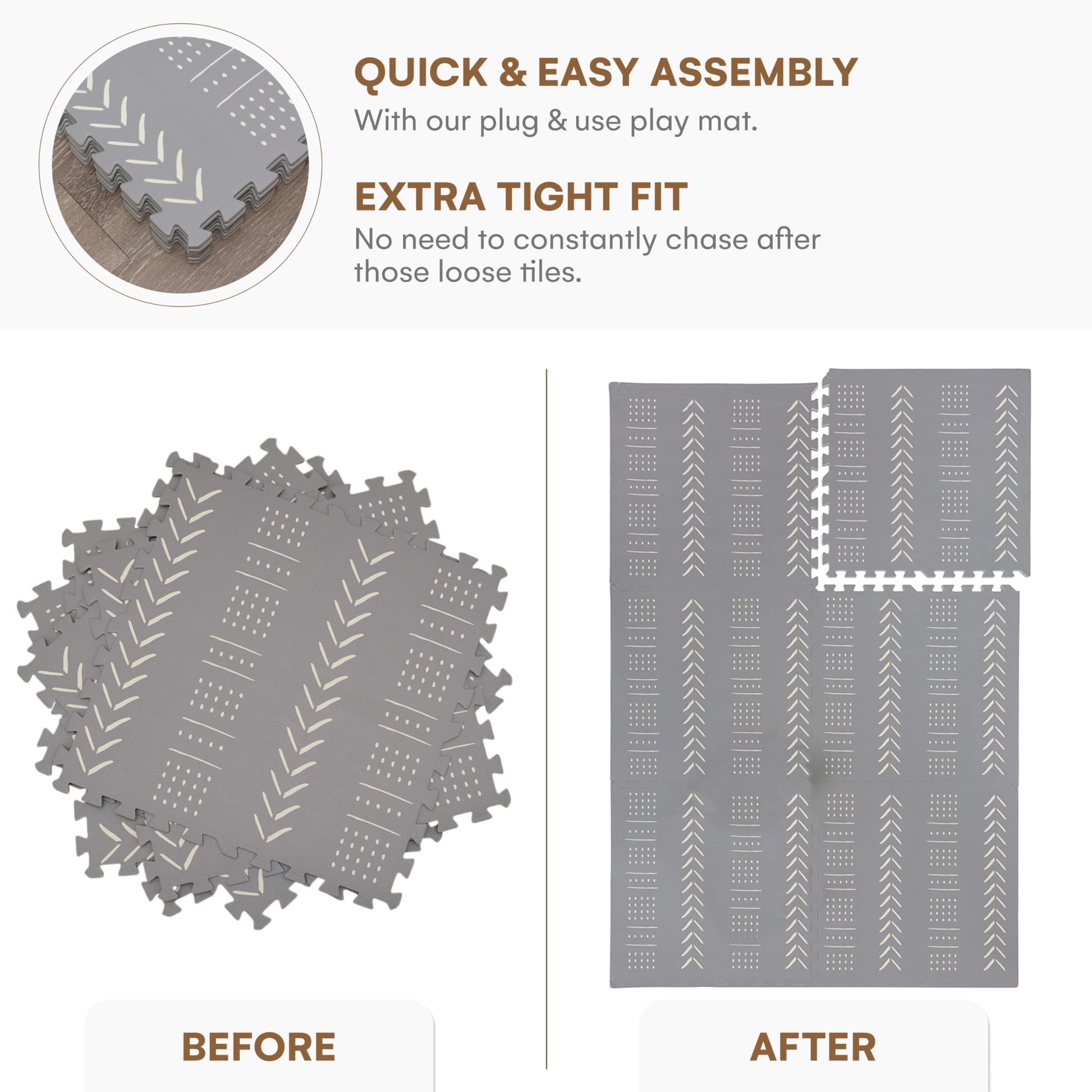 - Q: How many foam tiles are included with the play mat? A: The play mat comes with six interlocking foam floor tiles that create a cushioned area for play.