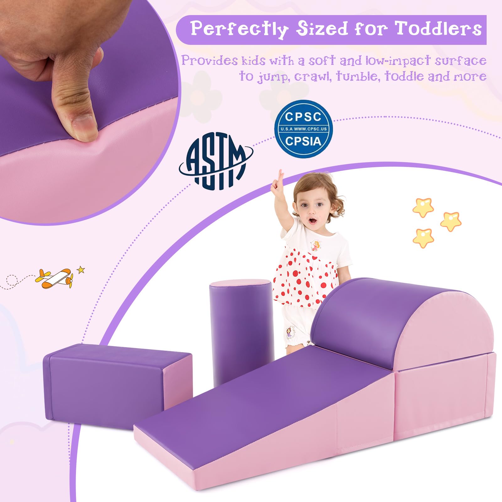 Description: This 5-piece foam play set will bring hours of fun for your child! This foam play set includes 5 soft foam blocks in different shapes, which are small rectangle, large rectangle, triangle, cylinder and half moon. The bright color stimulates kids to improve their motor skills, balance ability, body coordination and more. Certified by ASTM and CPSIA, this crawl and climb foam playset provides you with peace of mind. The EPE foam filling effectively reduces impact, and the soft surface and corners also protect kids from injuries. The waterproof PU cover features smooth zipper for quick detachment.     Features: Filled with soft and high resilience EPE foam Covered with waterproof PU cover for easy cleaning Zippered cover is removable if needed Contains 5 foam blocks in different shapes Made of child-friendly and durable material Promote kids motor skills, coordination, balance and more Suitable for home, daycare, preschool and more Certified by ASTM and CPSIA   Specifications: Color: Pink & Purple Material: PU + EPE Foam Dimension of Small Rectangle: 15.5' x 8' x 8' (L x W x H) Dimension of Large Rectangle: 15.5' x 15.5' x 8' (L x W x H) Dimension of Cylinder: 8' x 15.5' (D x H) Dimension of Half Moon: 15.5' x 15.5' x 8' (L x W x H) Dimension of Triangle: 23.5' x 15.5' x 8' (L x W x H) Net Weight: 7.5 lbs
