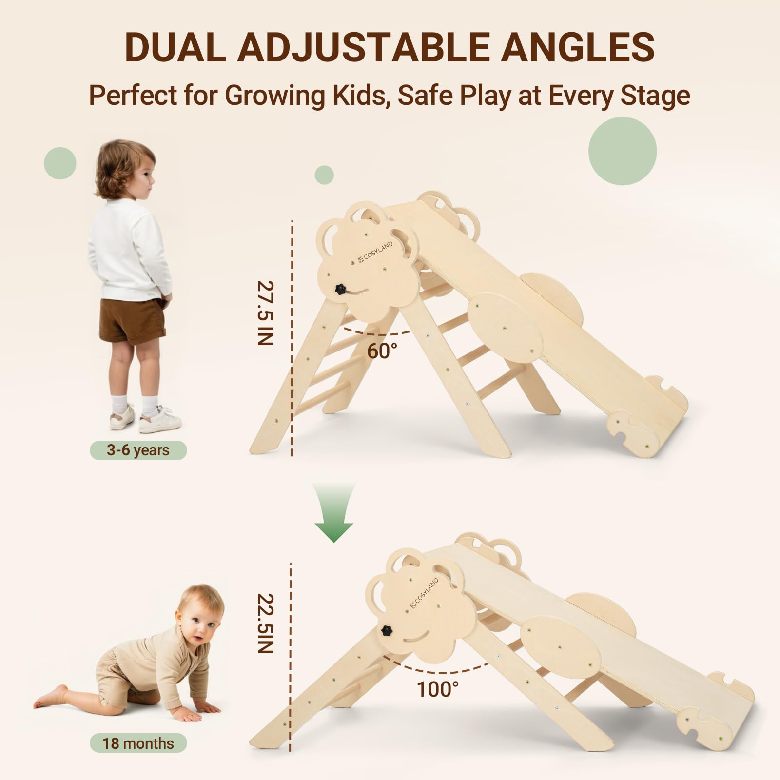 • Q: How does the adjustable angle feature work? A: The set features two adjustable angles: a 100-degree gentle slope for beginners and a 60-degree incline for more confident climbers, allowing children to build skills at their own pace.