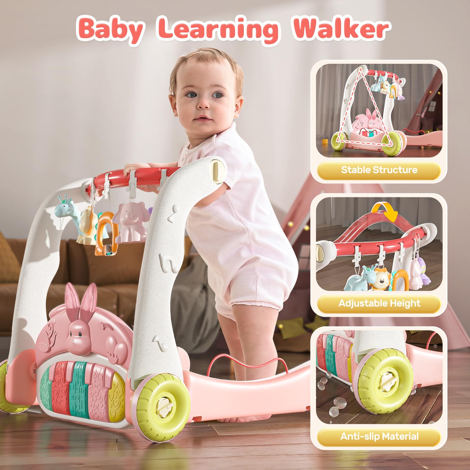 • Q: Is the baby walker safe for use? A: Absolutely, the baby walker features anti-slip handles and tires, and is crafted with no sharp edges to ensure safety during use.