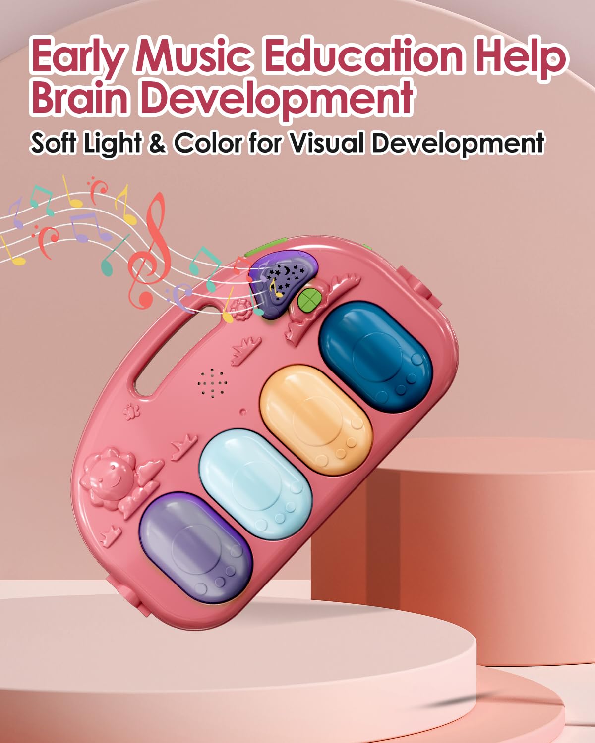 - Q: How does the musical piano work? A: The musical piano is kick-activated, encouraging babies to kick it for sounds and lights, which stimulates their auditory and visual senses.