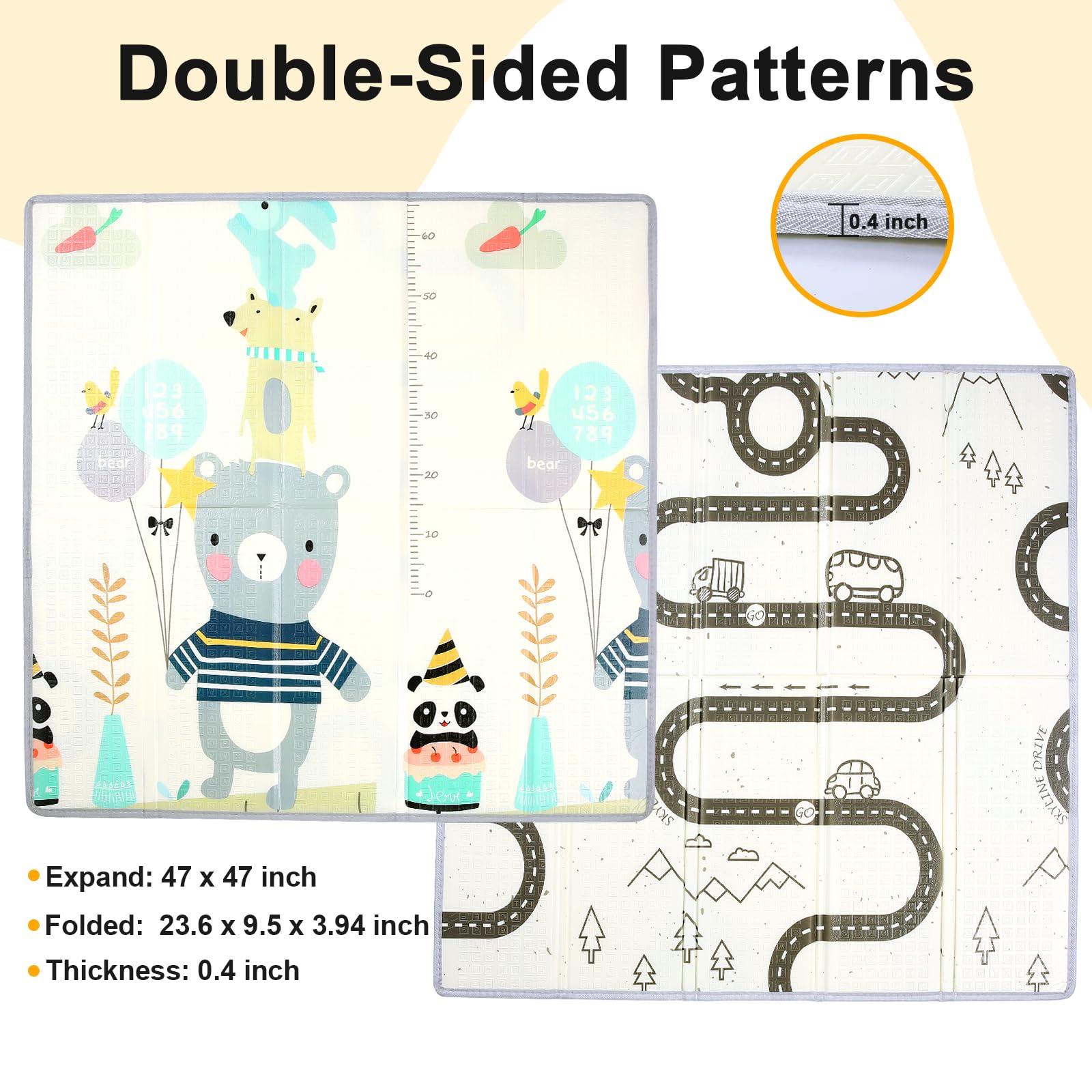 - Q: What are the dimensions of the Dovesail Foldable Baby Play Mat? A: The Dovesail Foldable Baby Play Mat measures 47 inches by 47 inches, making it suitable for a 50 inches by 50 inches playpen.