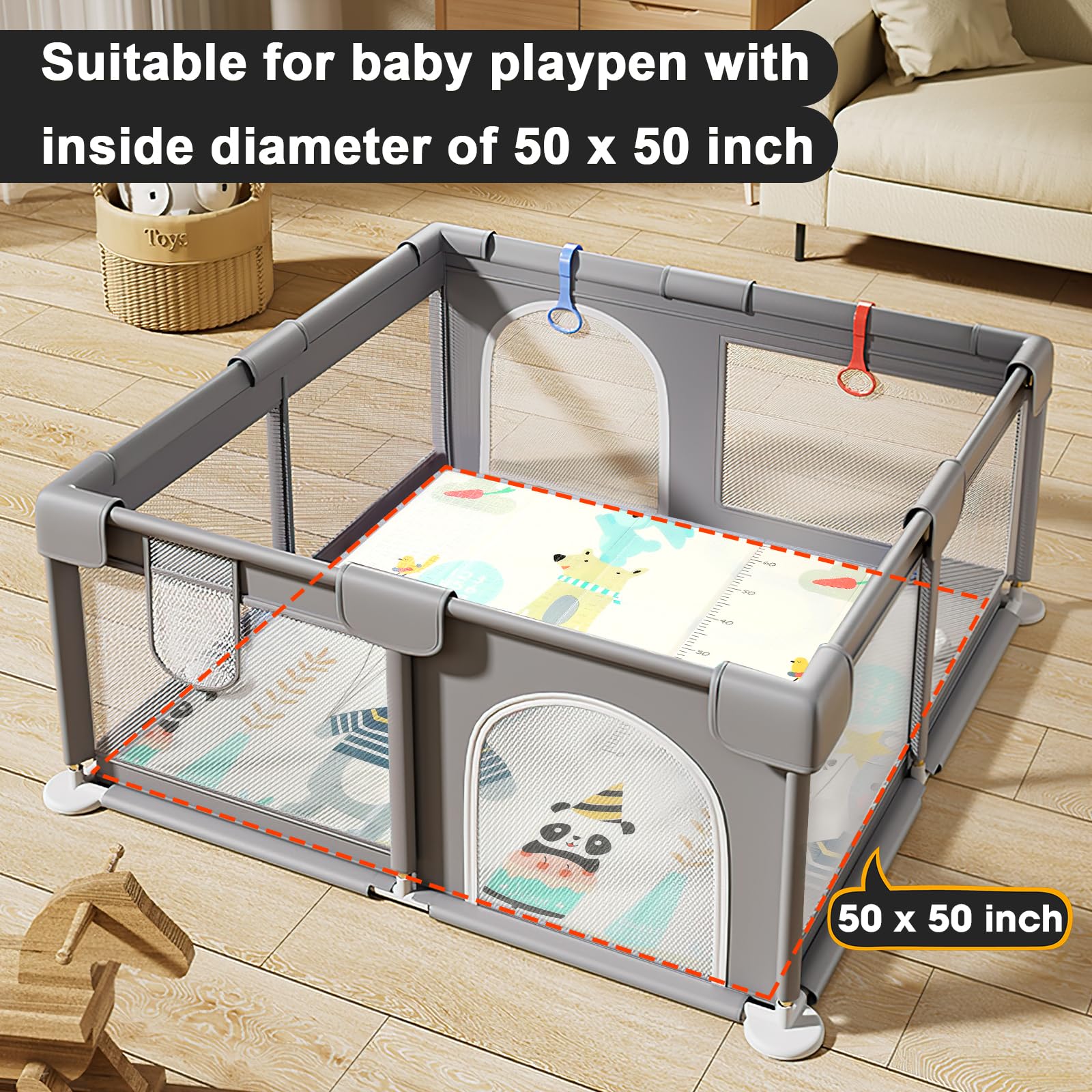 - Q: Can this mat fit in a standard playpen? A: Yes, the mat is designed to fit perfectly in a 47 inches by 47 inches or 50 inches by 50 inches playpen.