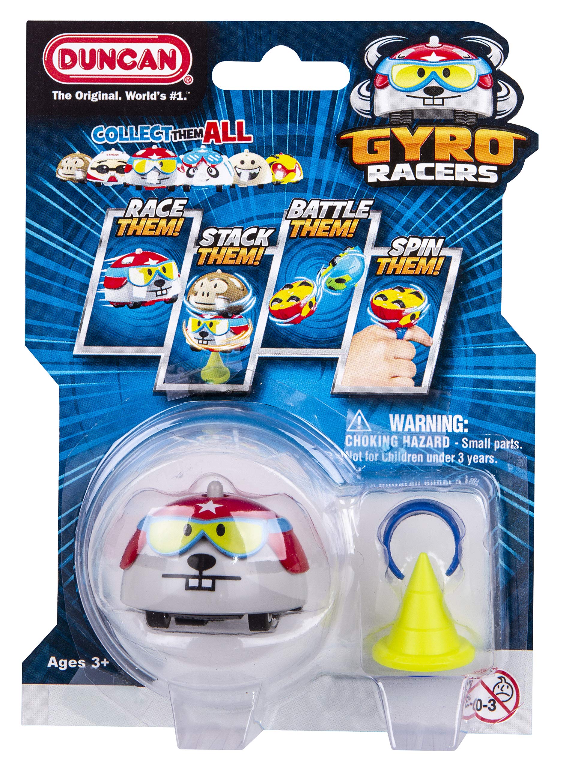 Race! Stack! Spin! Battle! So many play variations with Duncan Gyro Racers. With a heavy-duty gyroscope within each collectable character, simple rev up the Gyro Racers with only 1 or 2 thrusts. Play solo or with friends. You can spin them upright, upside down, on top of each other, or on the special ring or cone. And for battling.. Will you chose the will Throw Monkey or will you deploy the smiling Panda Bear for the win!