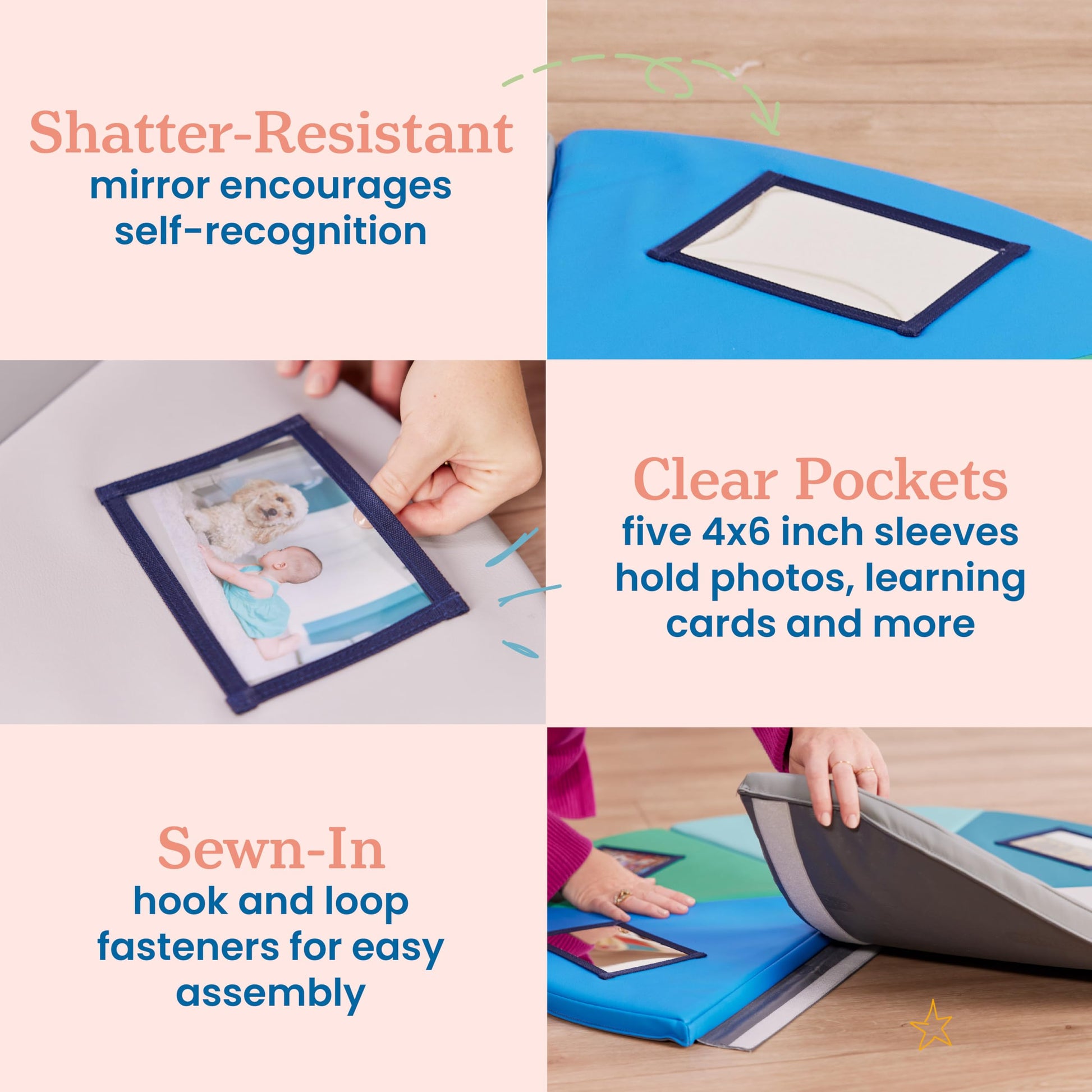 - Q: How does the play mat promote motor skills development? A: The mat features a baby-safe mirror and five picture sleeves that encourage reaching, crawling, and sensory exploration, which help improve gross motor skills, hand-eye coordination, and recognition.