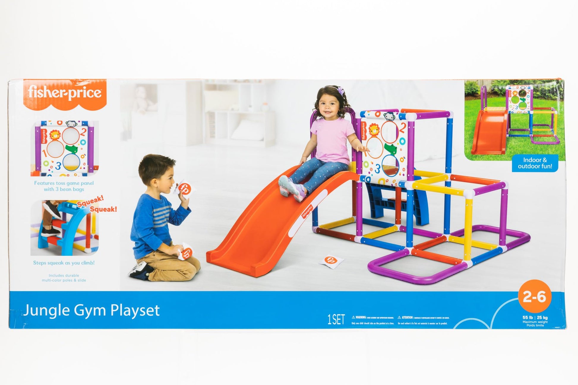 - Q: Does the Jungle Gym include any additional features? A: Yes, it includes an attachable slide that squeaks when stepped on and a toss game panel with Fisher-Price bean bags.