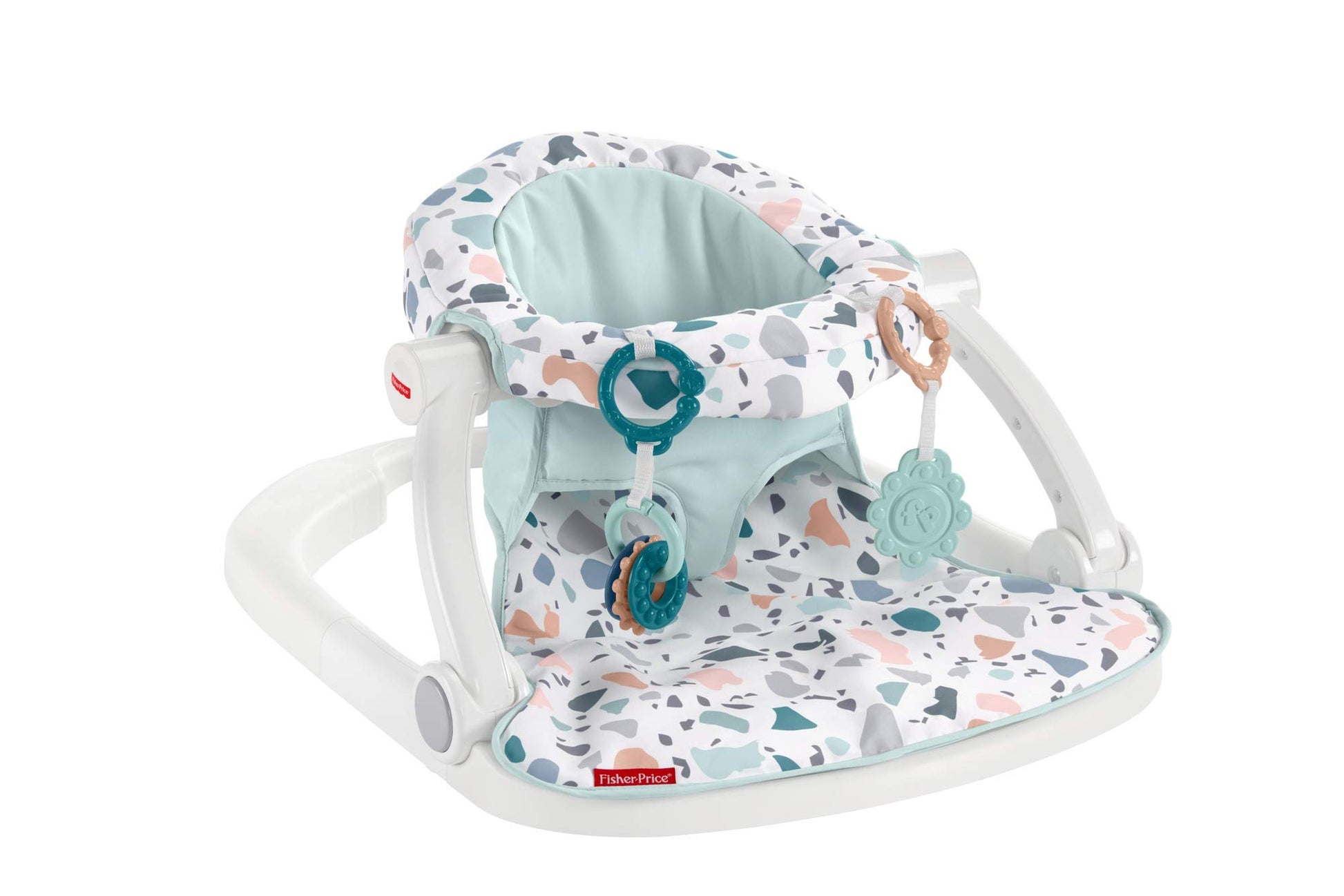 - Q: What features does the Fisher-Price Sit-Me-Up Floor Seat offer? A: It has a wide, sturdy base for support, two linkable toys for entertainment, and it folds flat for easy storage.