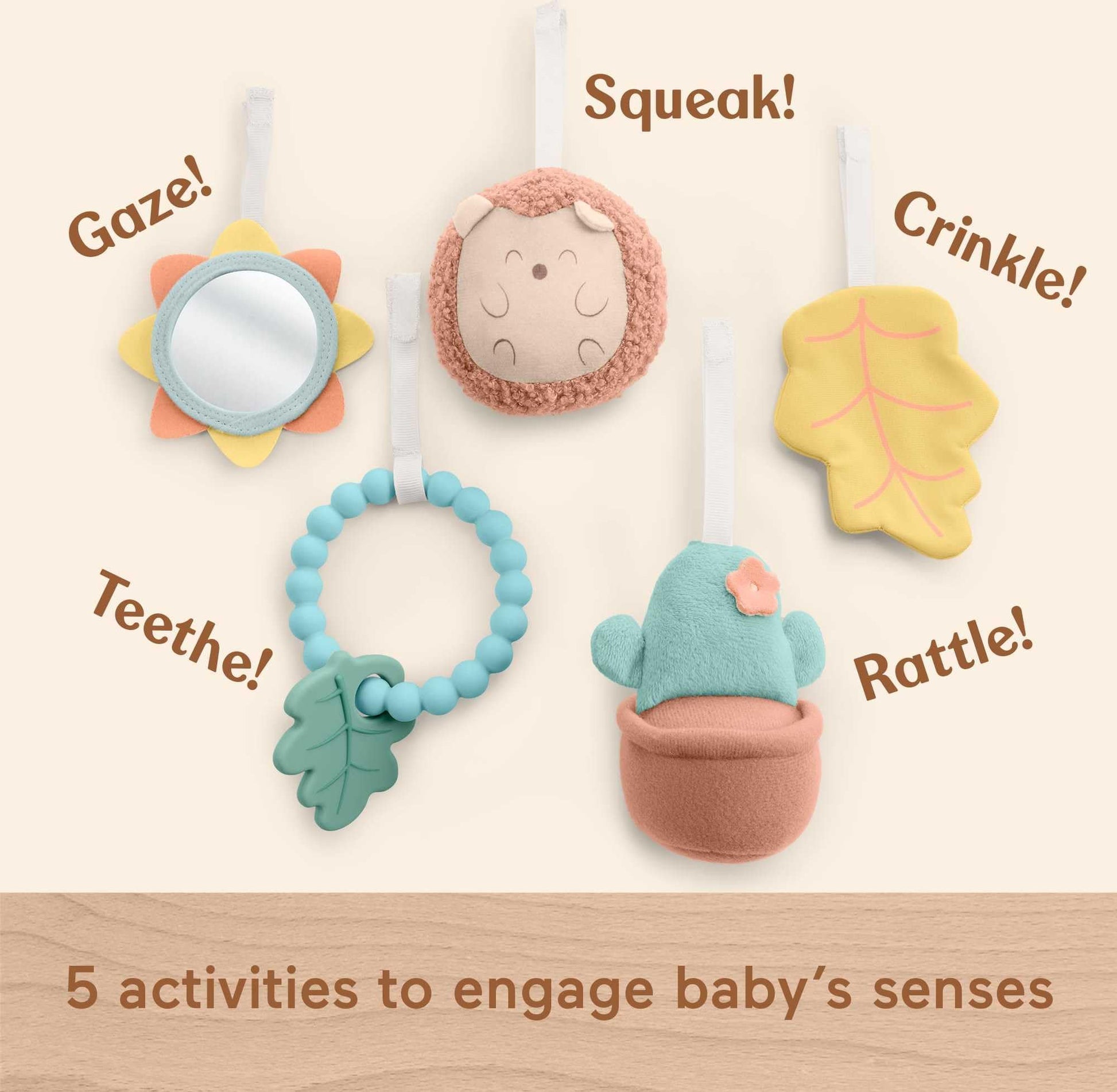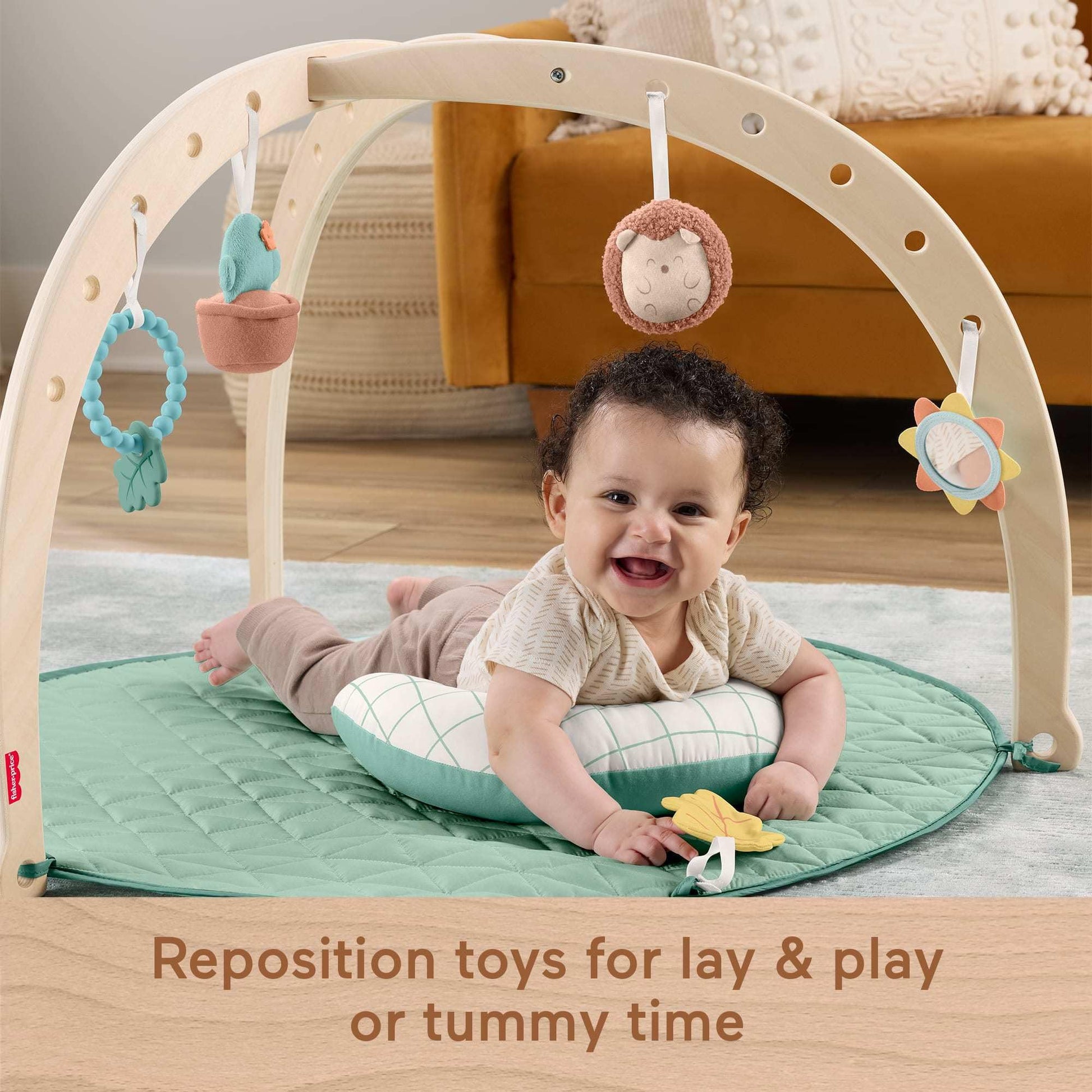 - Q: What toys are included with the Fisher-Price Wood Baby Playmat? A: The activity gym includes 5 repositionable toys: a hedgehog squeaker, sun mirror, crinkle leaf, BPA-free silicone teether leaf, and cactus rattle.