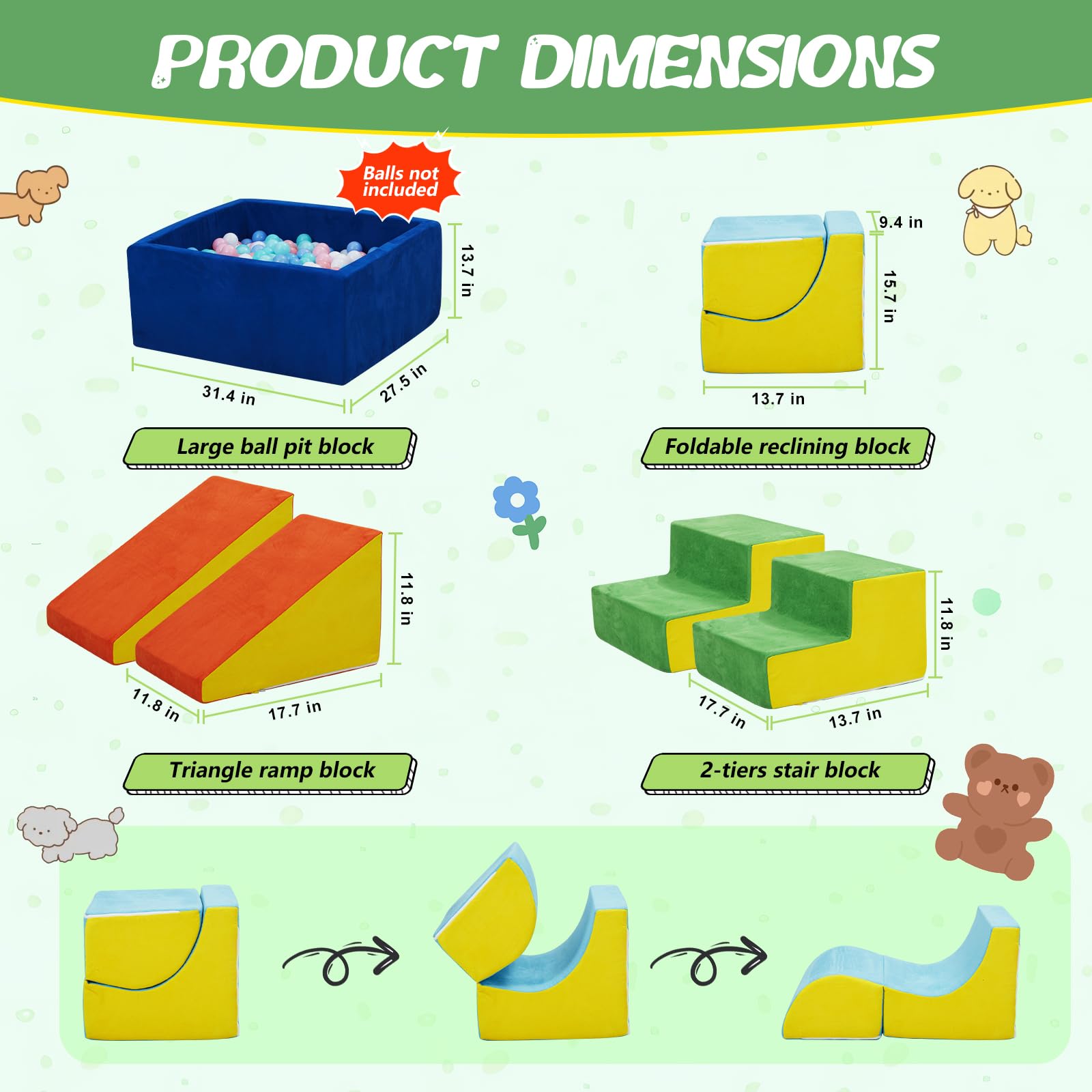 - Q: How many pieces are included in the set? A: The set includes a total of 6 pieces: 2 steps, 2 slopes, a lounger, and a ball pit.