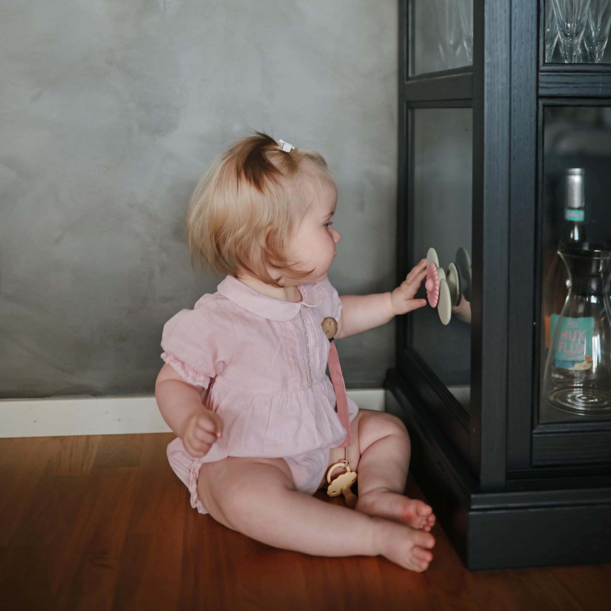 Featuring a playful design and soothing colors, our blossom suction spinner toy will captivate your little ones imagination. Littles can spin the 100% food-grade silicone leaves to create a delightful visual and soothing sensory experience. The sturdy suction ensures the spinner stays in place, preventing accidental drops and encouraging independent play. Keep babys attention at home or on-the-go by suctioning to highchairs, cabinet doors, airplane trays, or the bathtub.
