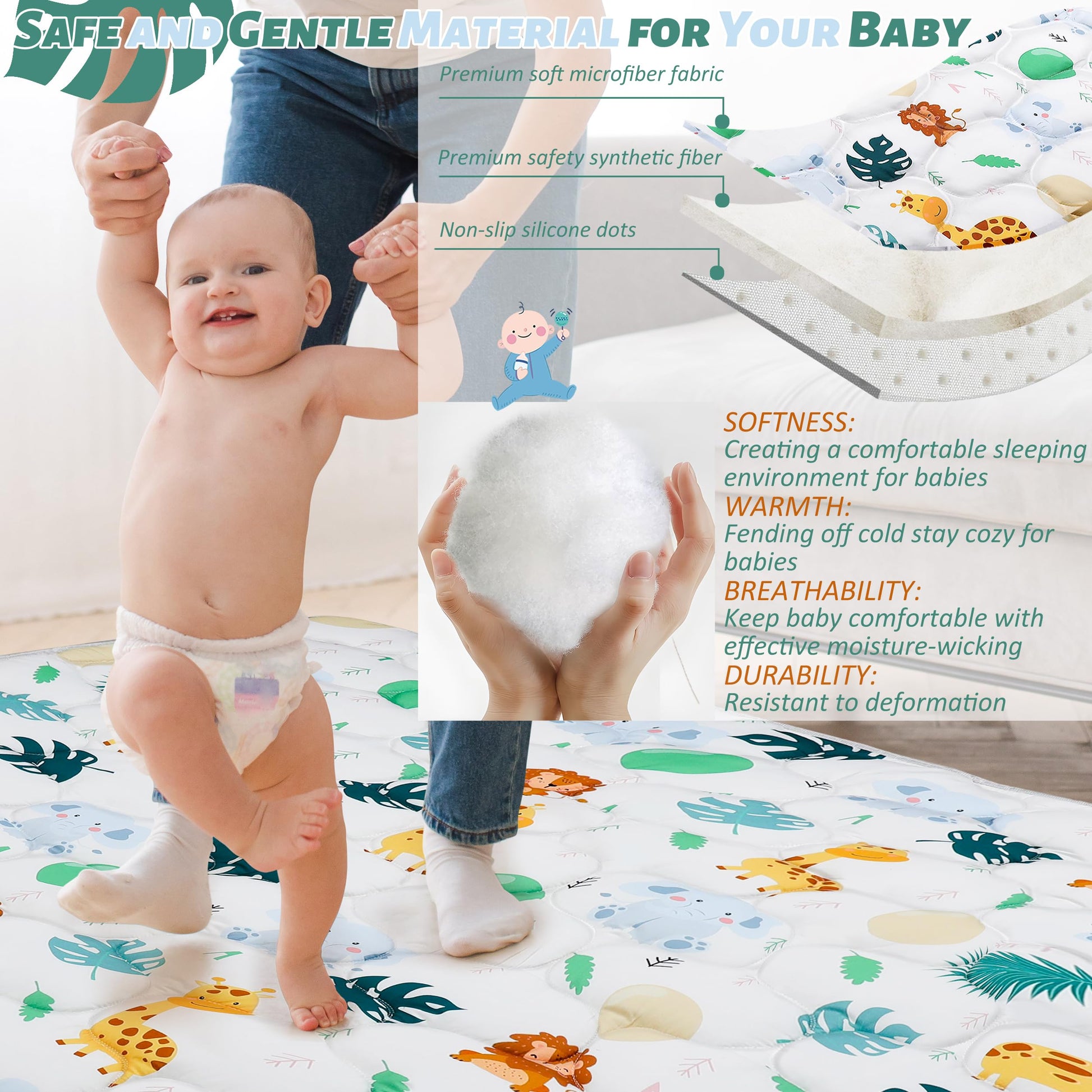• Q: Is the PLUUSHUU Baby Play Mat safe for infants? A: Yes, the mat is filled with premium synthetic fiber, is hypoallergenic, and has passed US CPC certification, ensuring it is safe for infants.