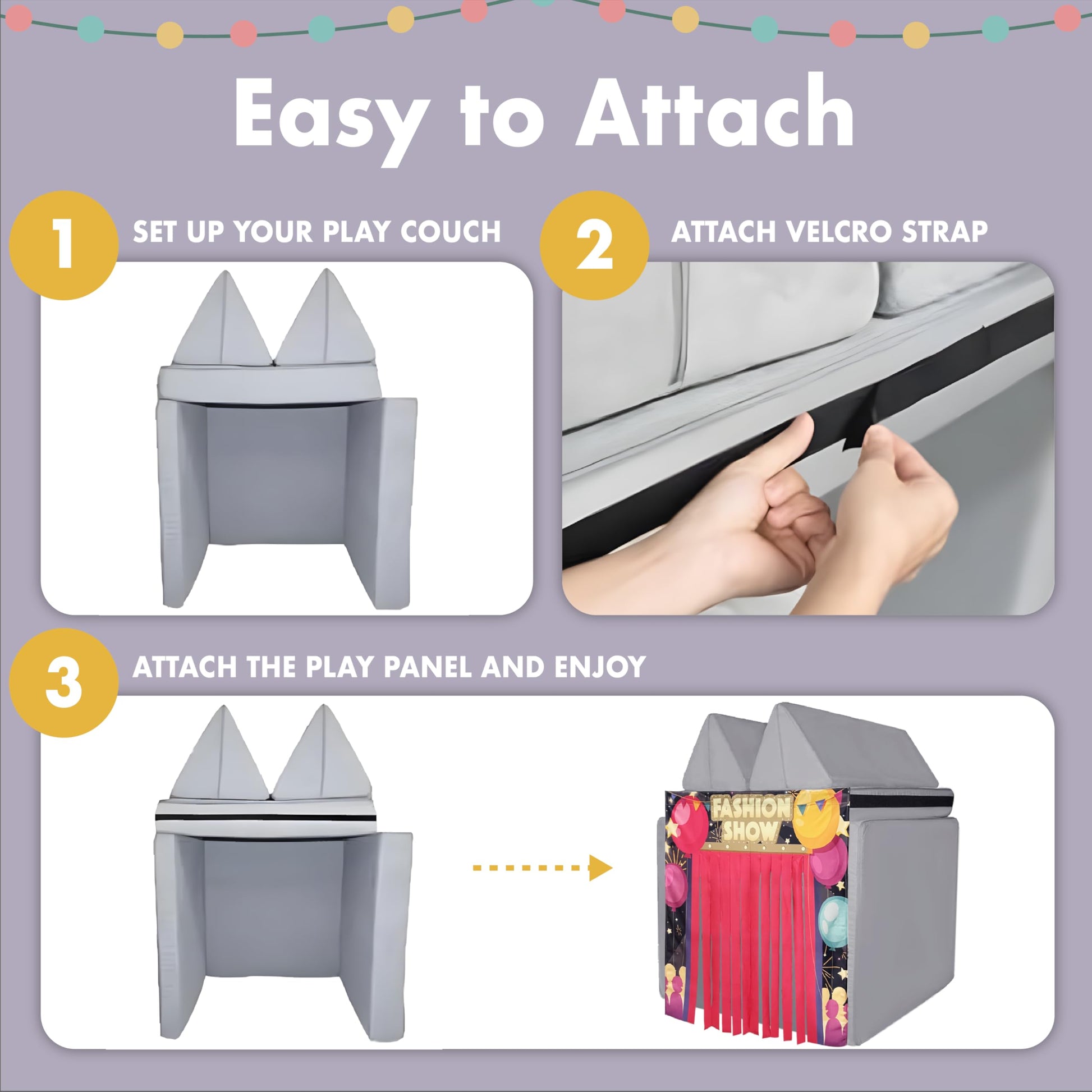 - Q: How does the play panel attach to the couch? A: The Fashion Show Play Panel includes a 12-foot Velcro strap that allows for easy attachment and a snug fit.