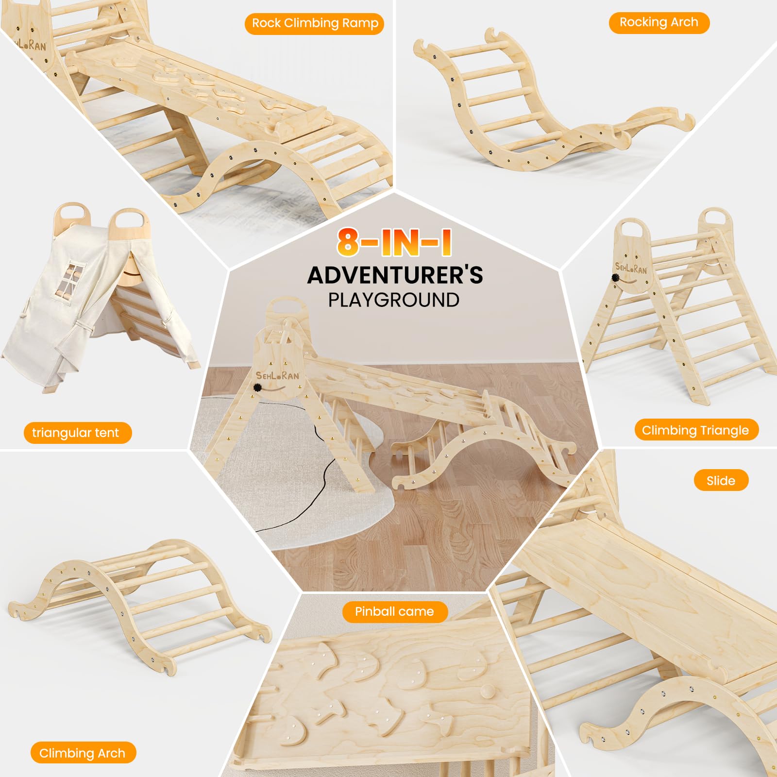 - Q: What play options does the Pikler Triangle Set offer? A: The Pikler Triangle Set includes nine engaging play modes such as climbing, sliding, and an integrated Pinball Game, enhancing motor skills and coordination.
