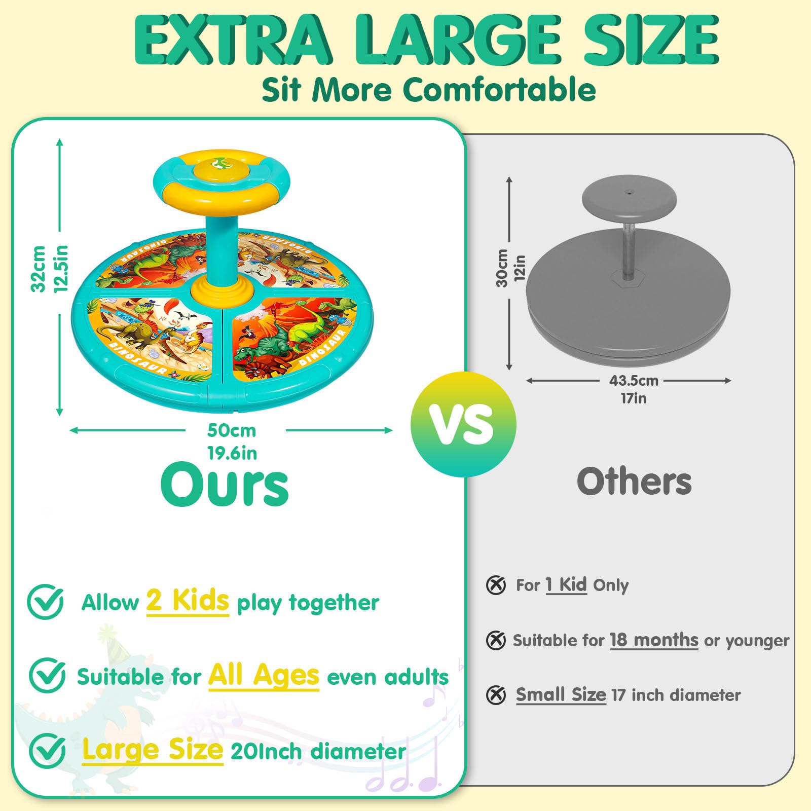 - Q: How large is the sit and spin toy? A: The sit and spin toy features a sturdy chassis measuring 19 inches, making it suitable for both children and adults.