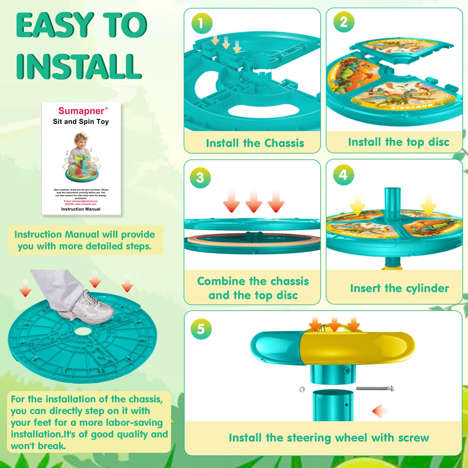 - Q: What materials are used to make the toy? A: The Sumapner Dinosaur Sit and Spin Toy is made from durable plastic, ensuring it can withstand active play.