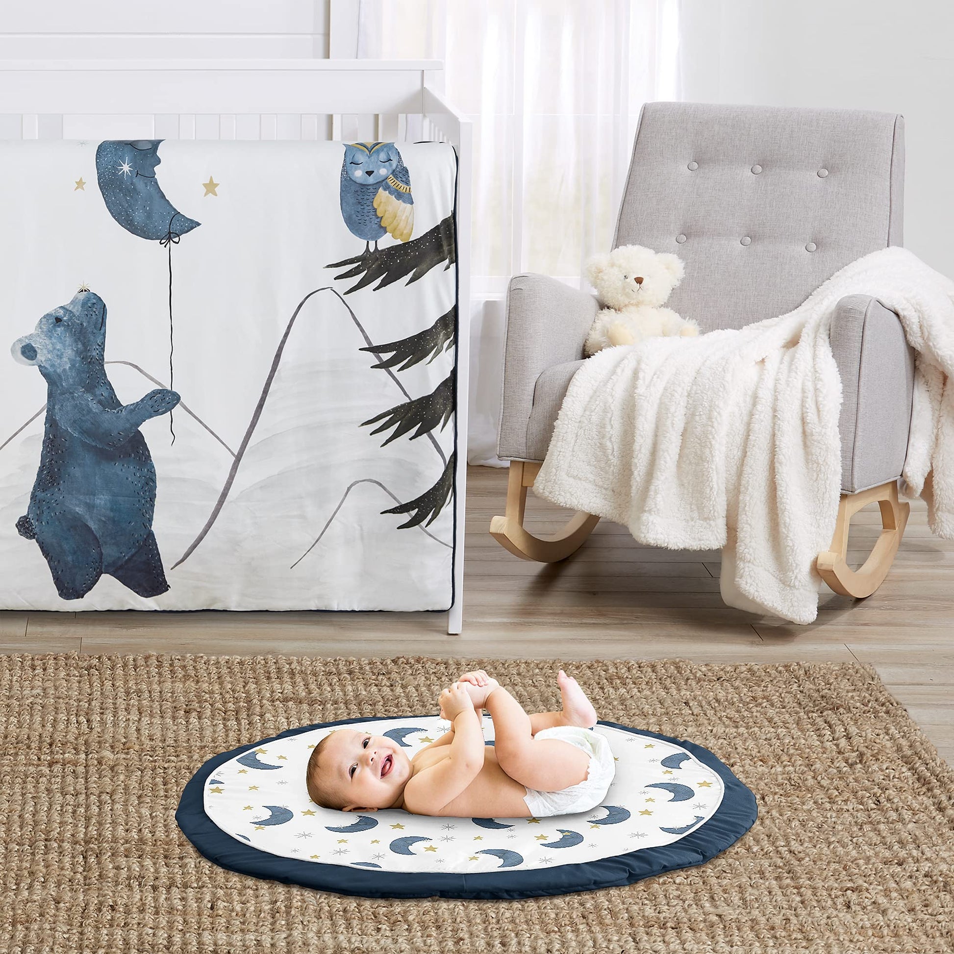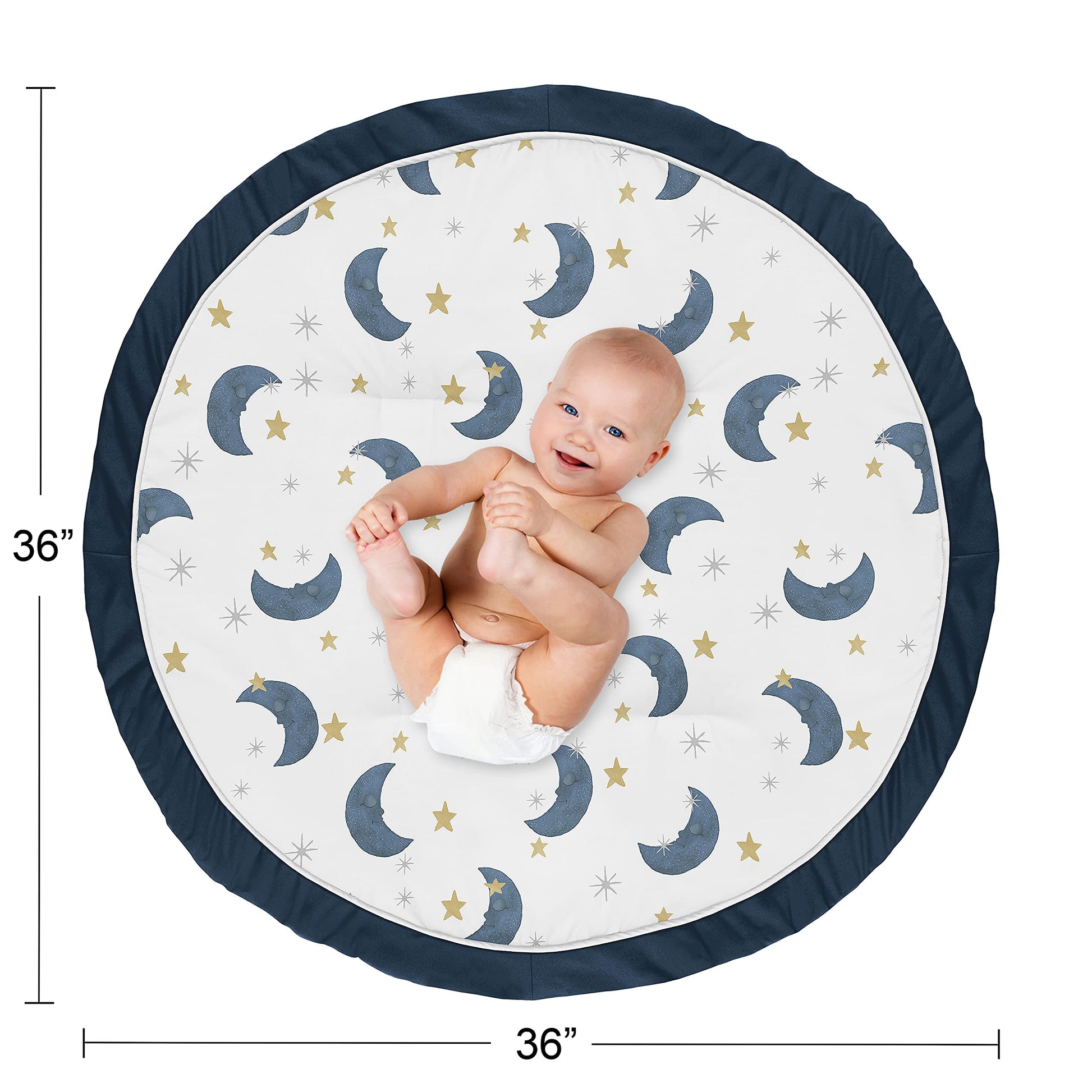 - Q: Is the playmat suitable for both boys and girls? A: Yes, the design features a navy blue and gold celestial print that is gender neutral, making it suitable for both boys and girls.