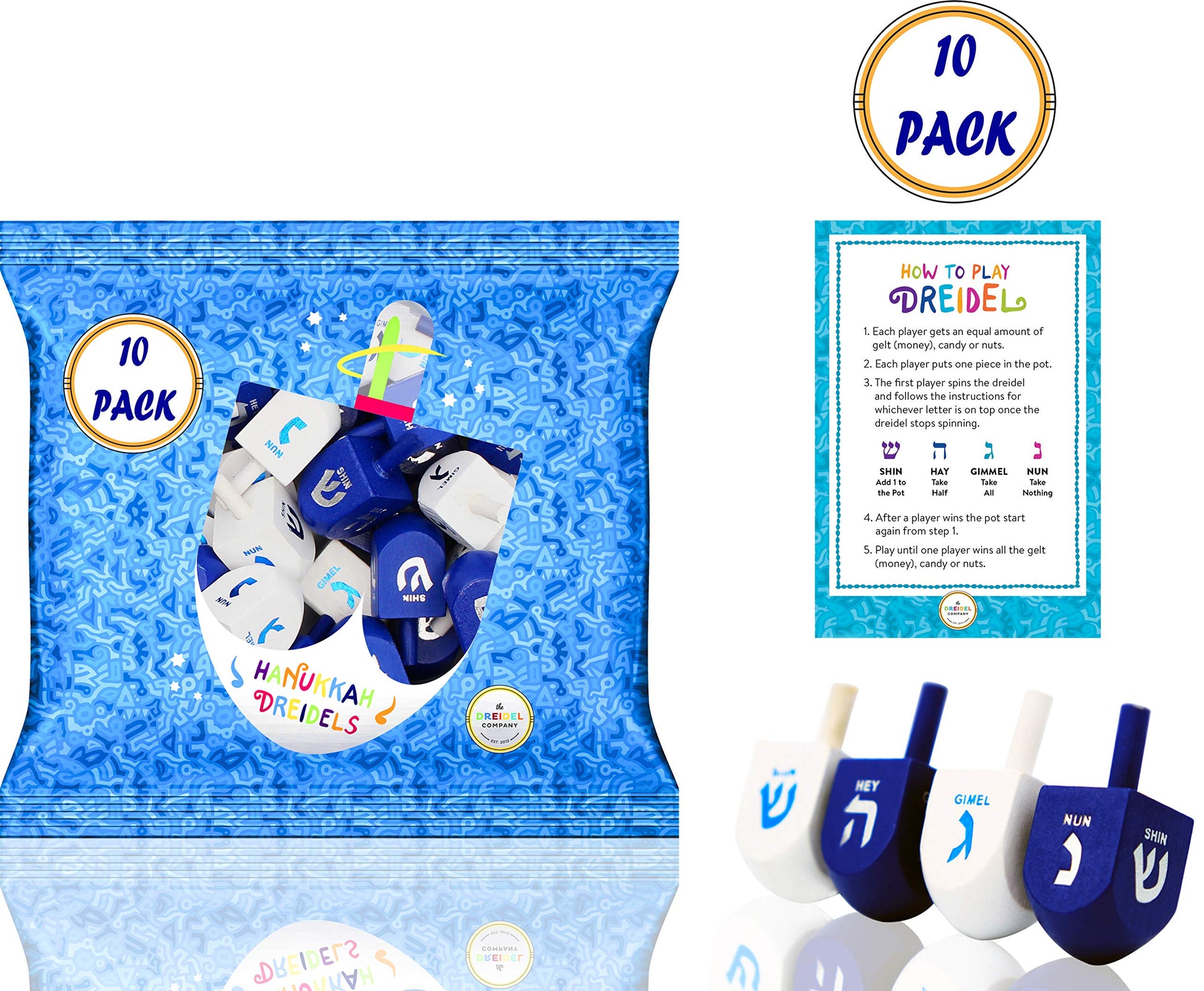 • Q: How many dreidels are included in each pack? A: This listing includes a pack of 10 solid blue and white hand-painted wooden dreidels.