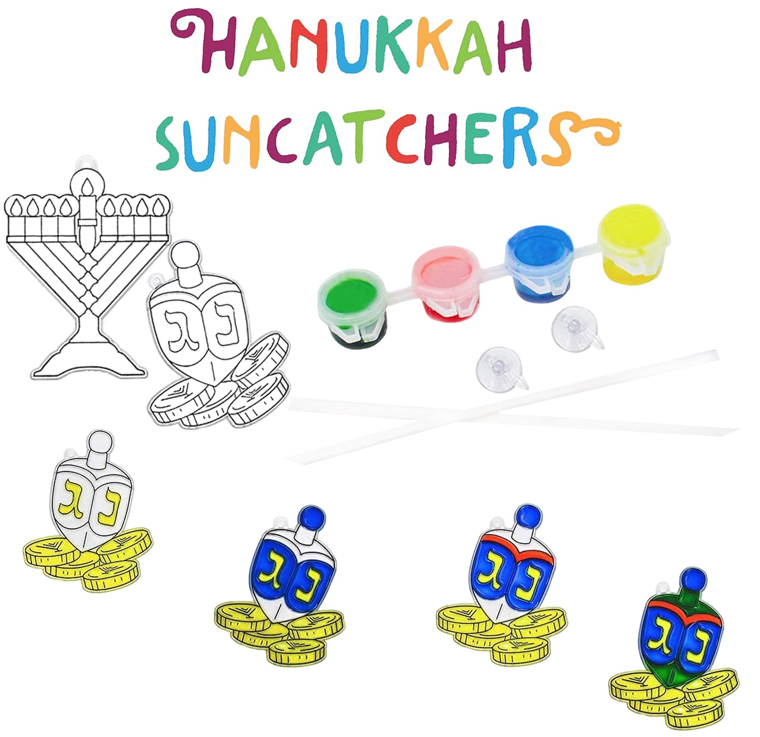 - Q: What is included in the Hanukkah Sun Catcher kit? A: The kit includes three packs, each containing two suncatchers, two suction cups, four colors of paint, and one color applicator.