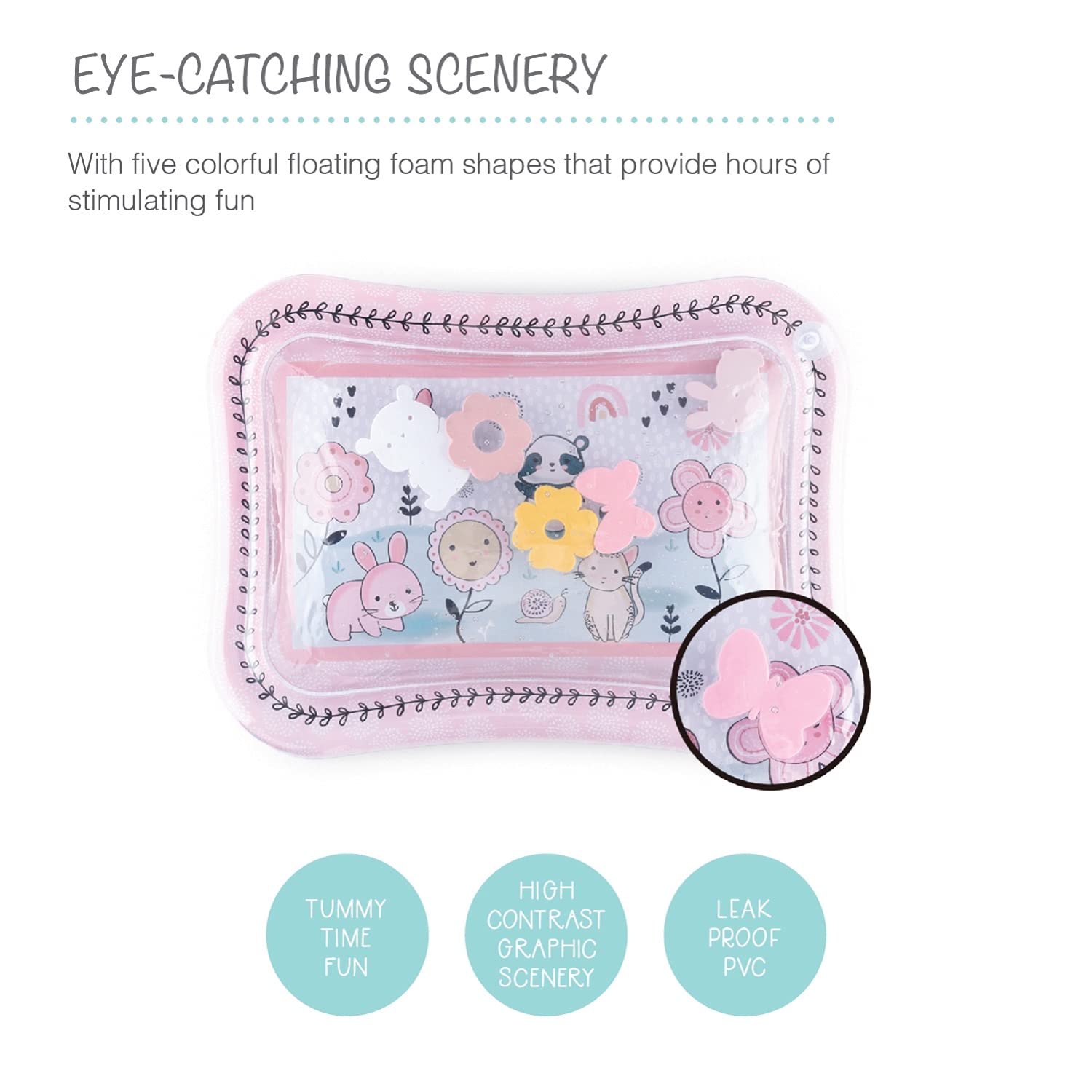 - Q: How does the water play mat support sensory development? A: This mat features high contrast floating animals and flowers that engage infants in visual tracking and exploration, promoting sensory development.