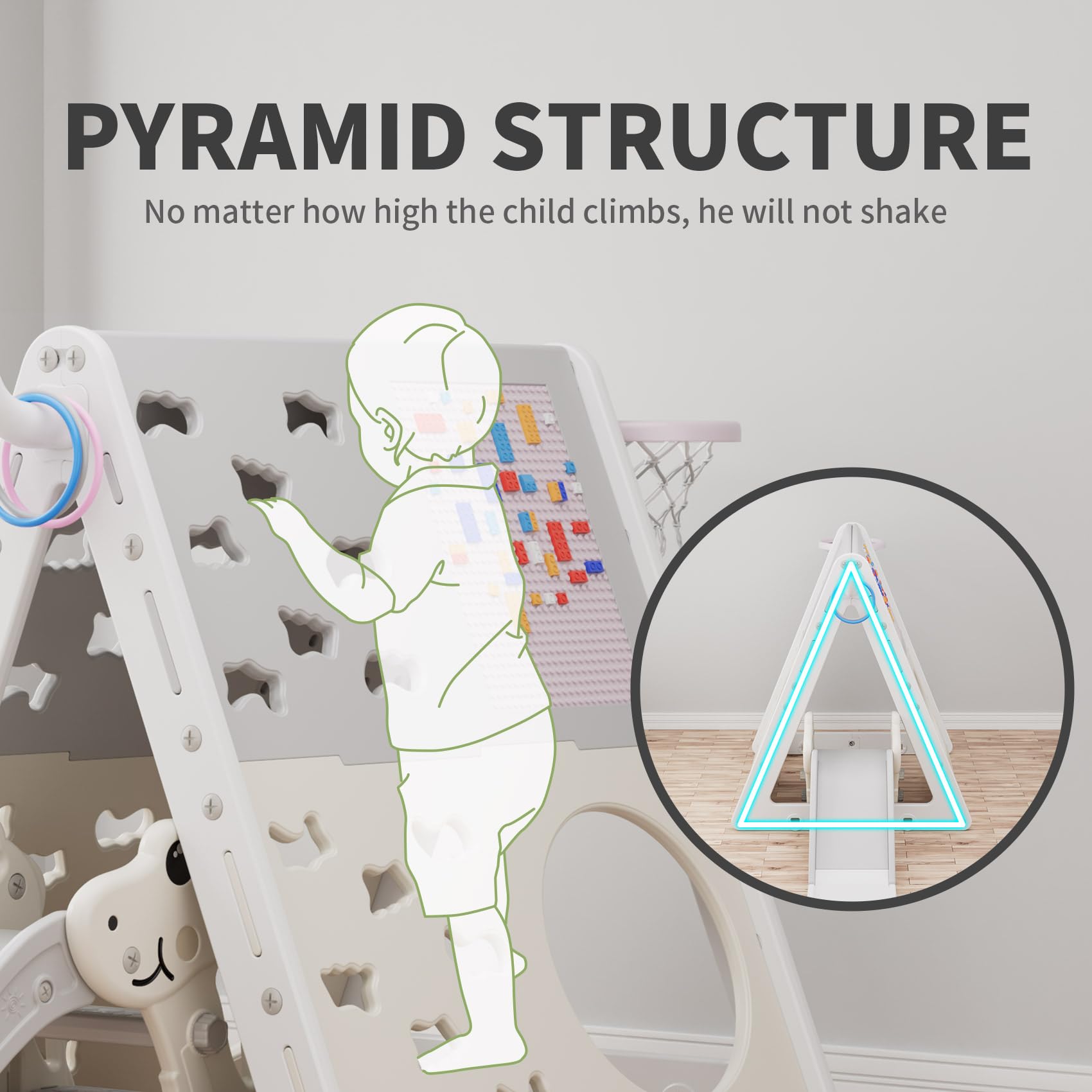 • Q: Is the slide included with the climbing pyramid safe for kids? A: The slide included with the climbing pyramid is designed with safety in mind, featuring a charming buffer design to ensure a safe sliding experience.