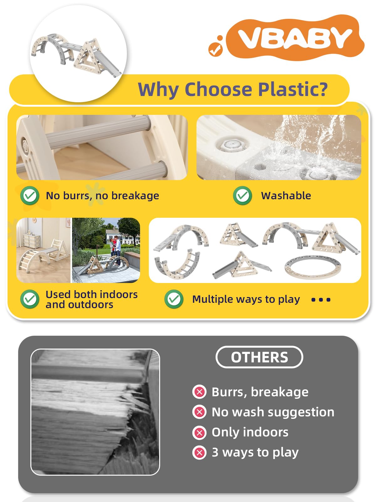 - Q: What is included in the VBABY Pikler Triangle Set? A: The VBABY Pikler Triangle Set includes one Pickler Triangle Structure, two Slide/Ramps, and one Climbing Arch.