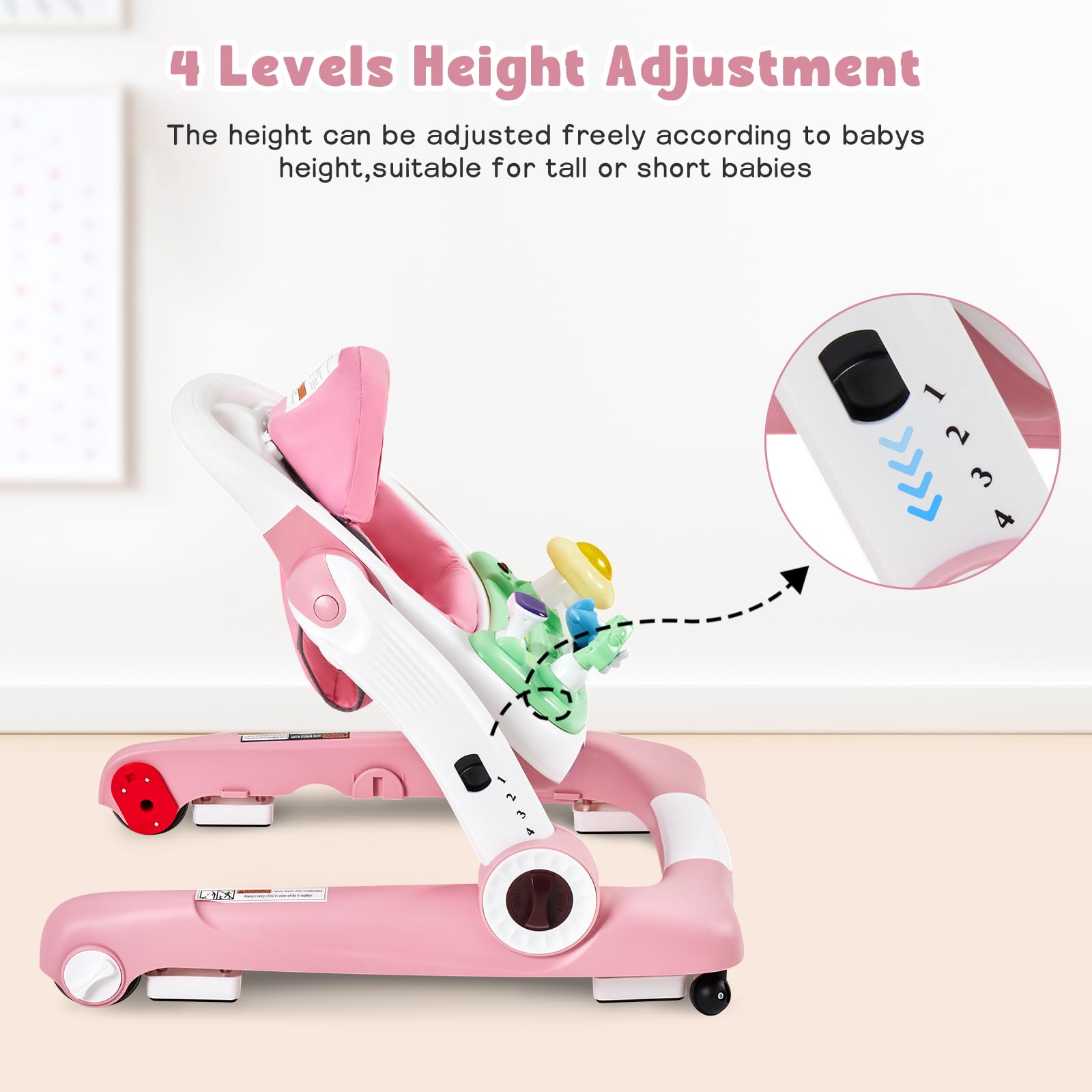 - Q: What type of wheels does the baby walker have? A: The baby walker is equipped with four smooth and silent universal wheels for easy and quiet movement.