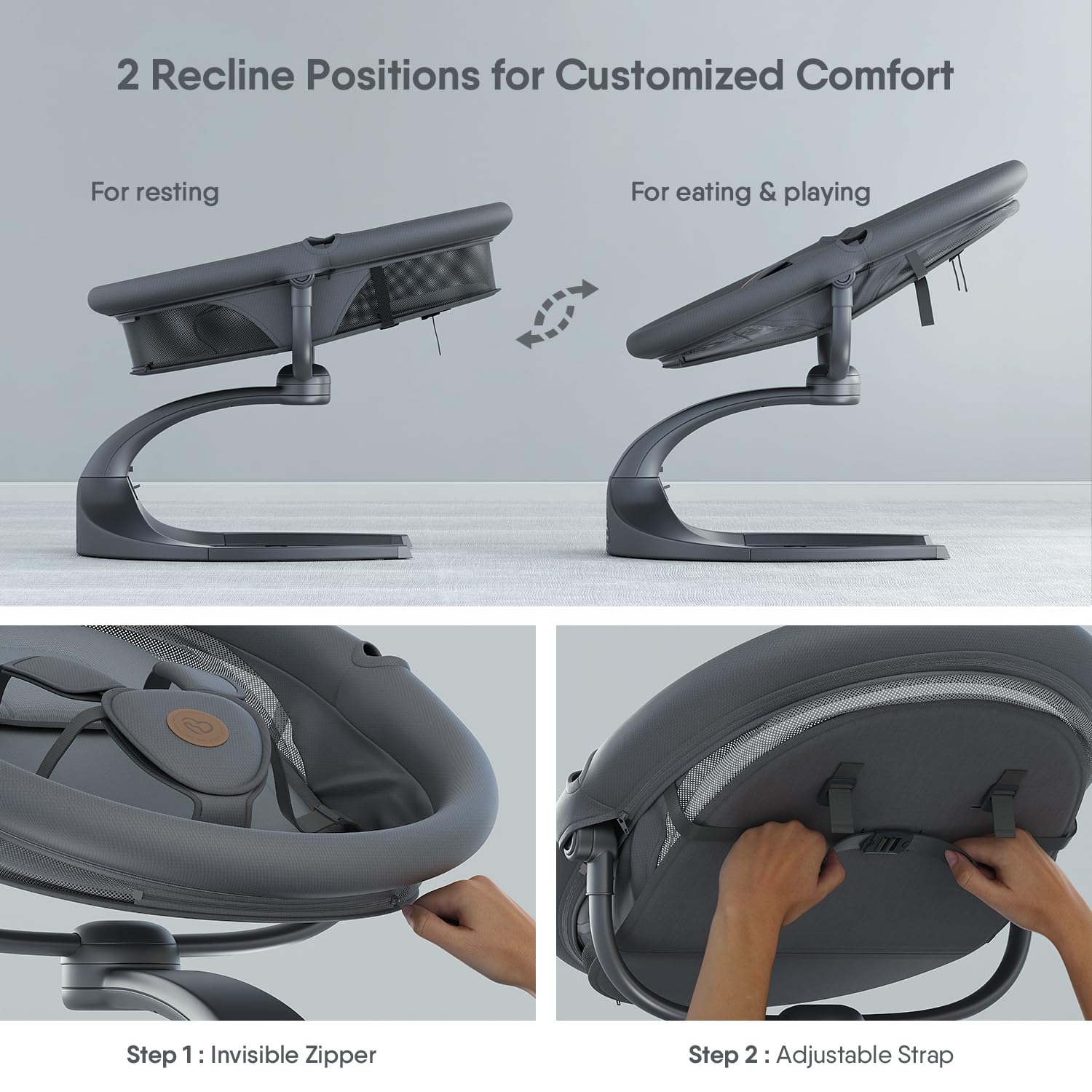 - Q: Does the Baby Swing have adjustable seat positions? A: Yes, the Baby Swing offers two adjustable seat positions to accommodate your baby's spine development, with angles of 27 degrees for play and 12 degrees for rest.
