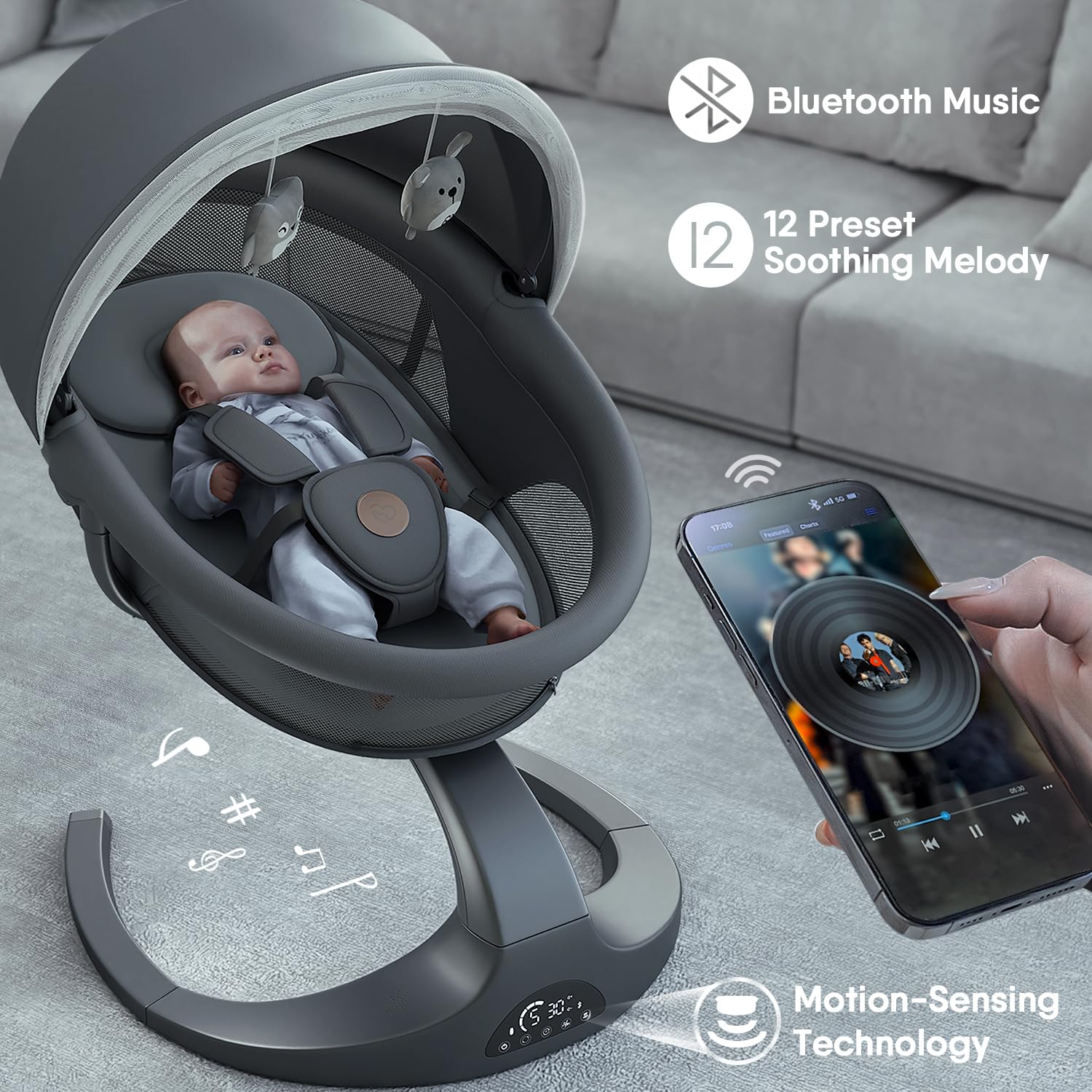 - Q: What is the unique feature of the Baby Swing's rocking mechanism? A: The Baby Swing features an innovative auto-rocking technology that detects when the baby is moving and begins to rock gently, while remaining stationary when the baby is calm.