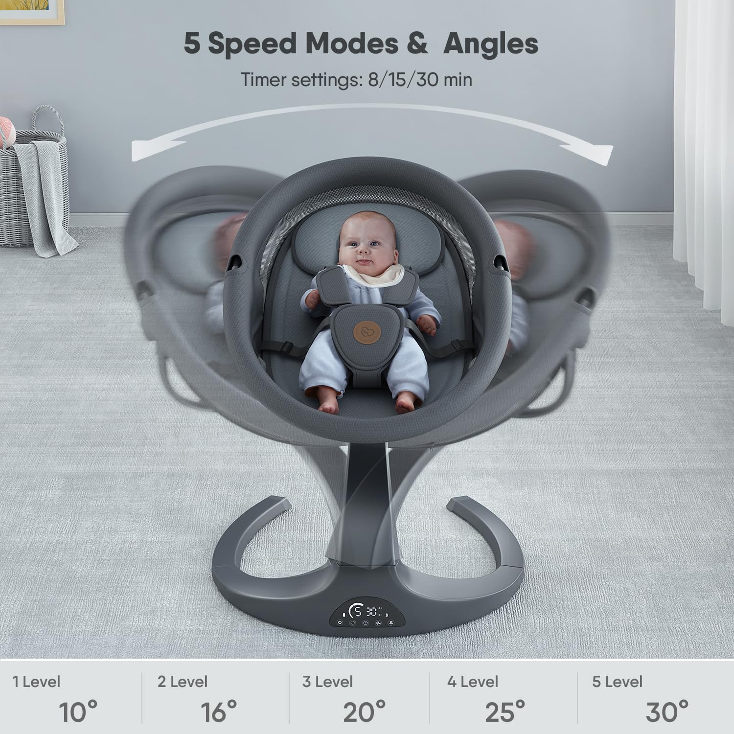 - Q: How many speed settings does the Baby Swing have? A: The Baby Swing features five adjustable speed settings to cater to your baby's preferences for soothing and comfort.