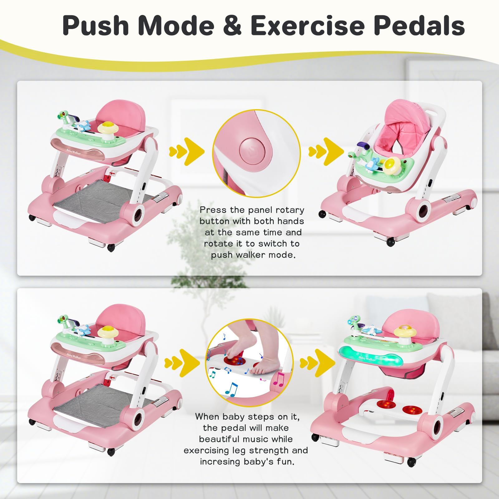 - Q: Does this baby walker come with music and toys? A: Yes, the baby walker includes music and toys designed to stimulate your baby's senses and support their early development.