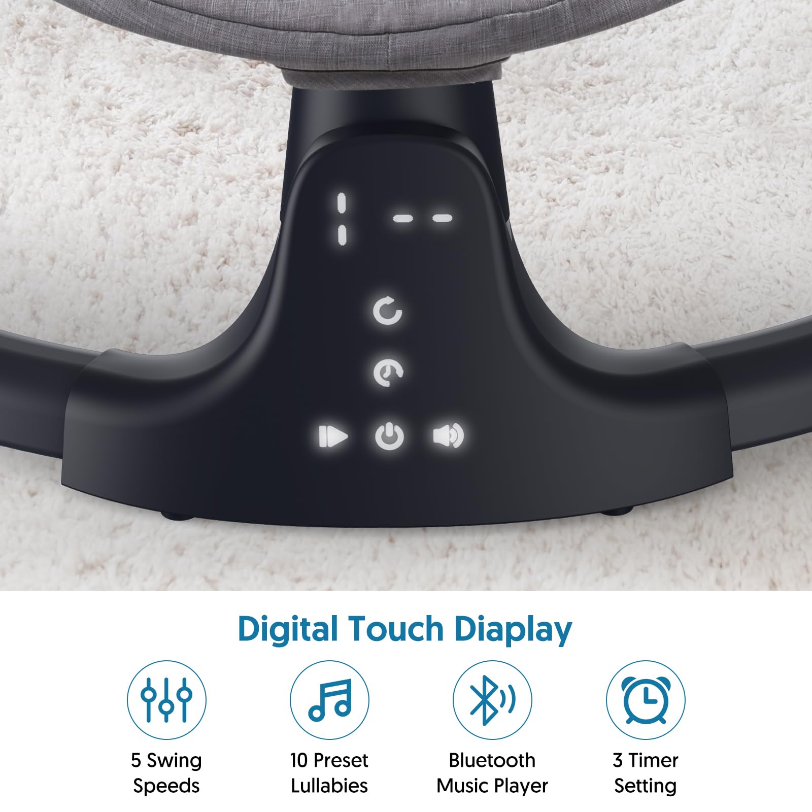 - Q: How does the swing's Bluetooth feature work? A: The swing's Bluetooth feature allows you to connect your phone and play your baby's favorite music or stories through the built-in speaker, enhancing the entertainment experience.