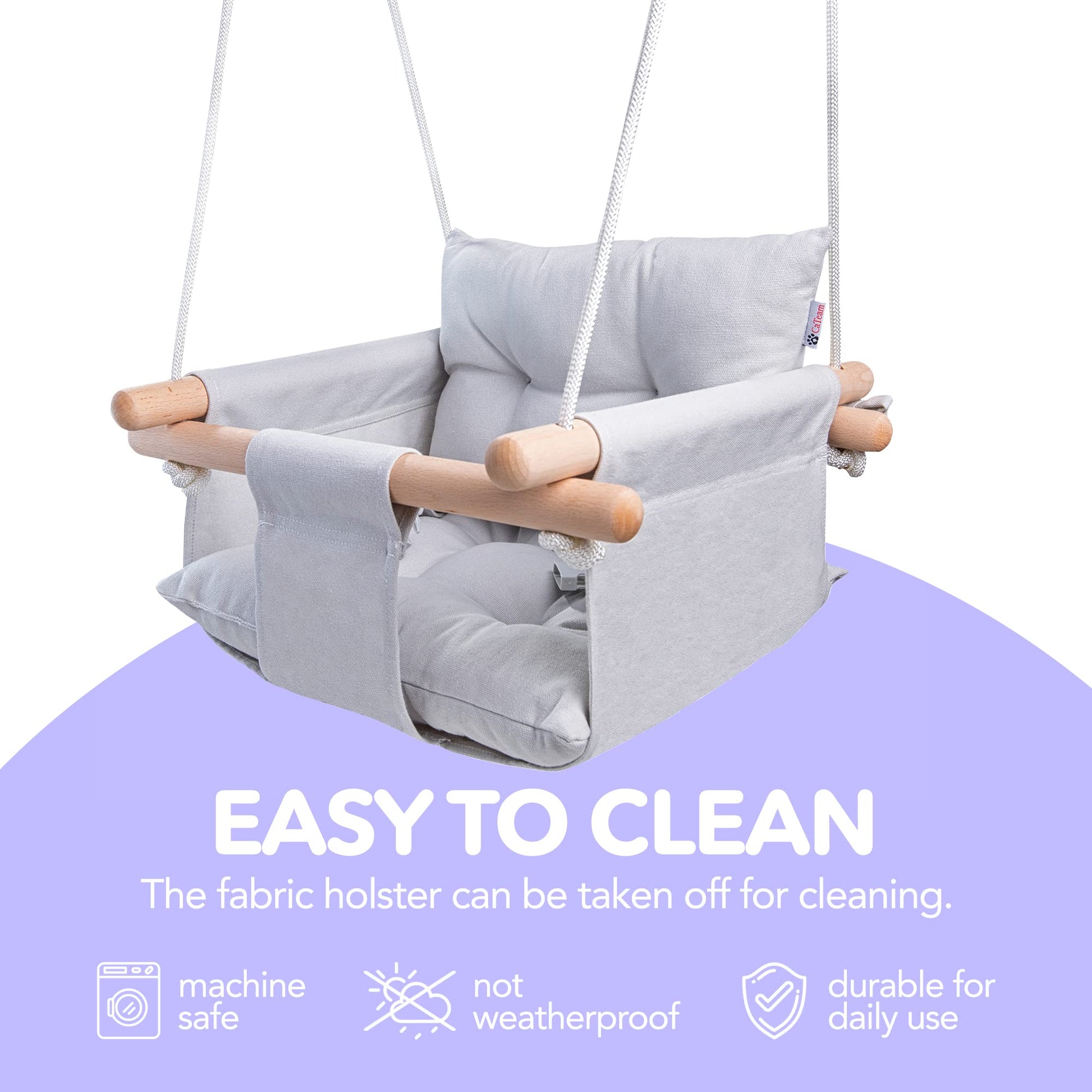 - Q: How do I wash the Canvas Baby Swing and its pillows? A: The fabric holster and pillows are machine washable at a temperature of 86 degrees Fahrenheit, using a delicate cycle.